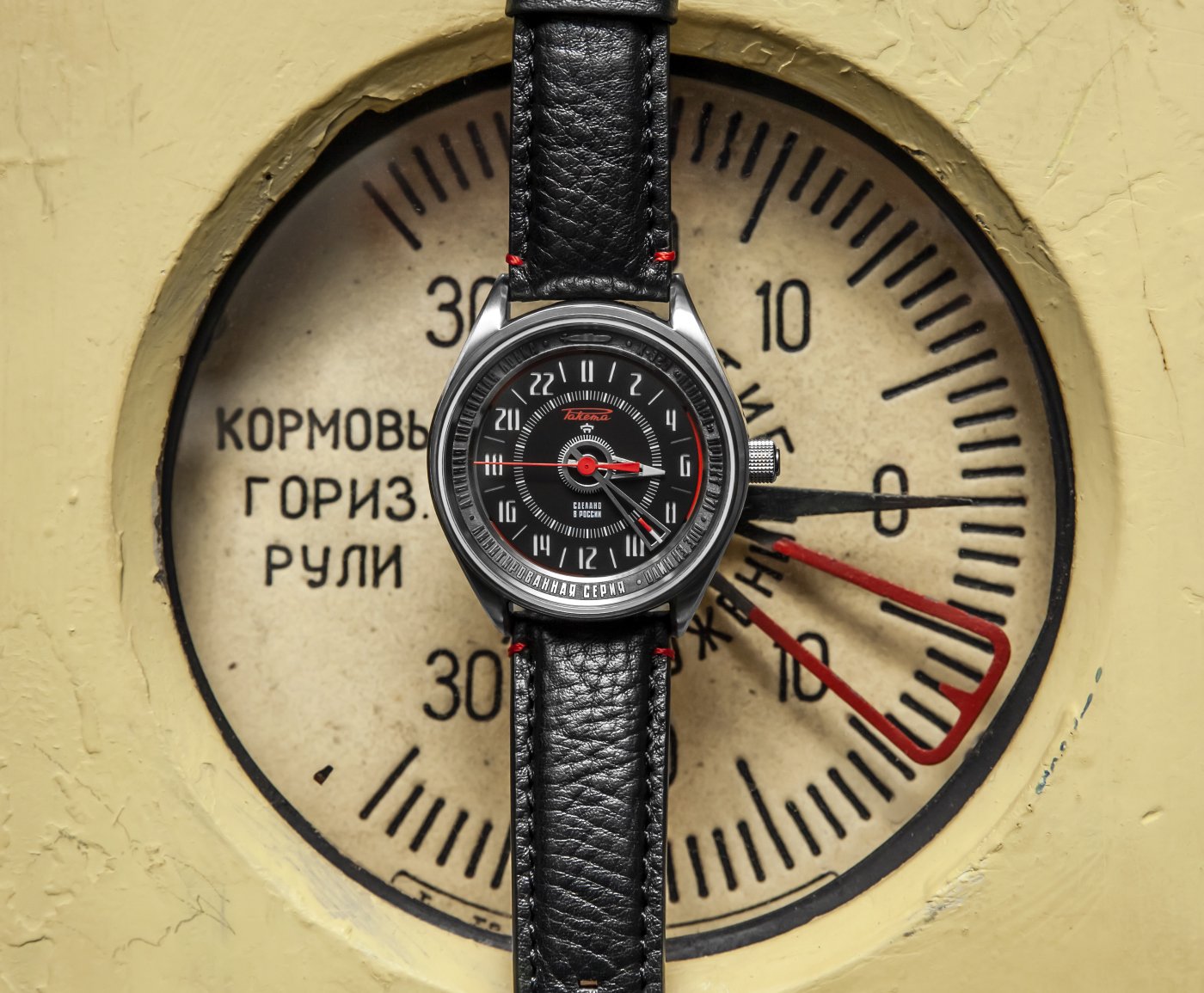 In addition to the bezel made from a metal part of the “Leopard” submarine, the Raketa “Leopard 24” model is also a submariner’s watch by design and functionality:
