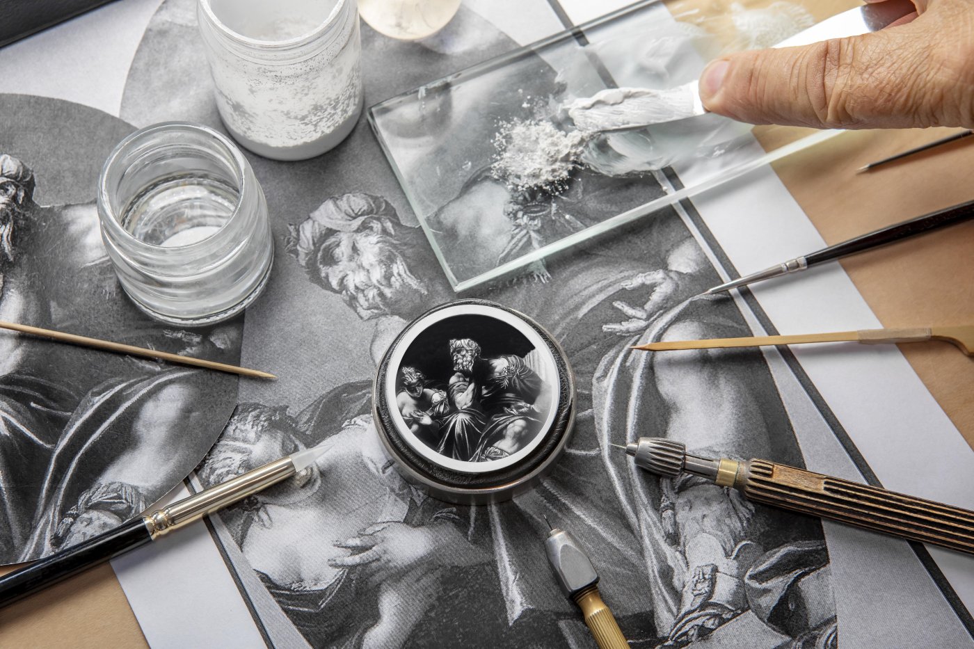 The delicate skill involved in miniature enamel – in its version known as the “Geneva technique” dating from the 18th century – is reserved for the most experienced artisans mastering both pigments and fire. One of the main challenges consists in composing a colour palette compliant with the original shades of the work, while remaining keenly aware that the multiple firings in the kiln at over 800°C are liable to alter its colour and brilliance.