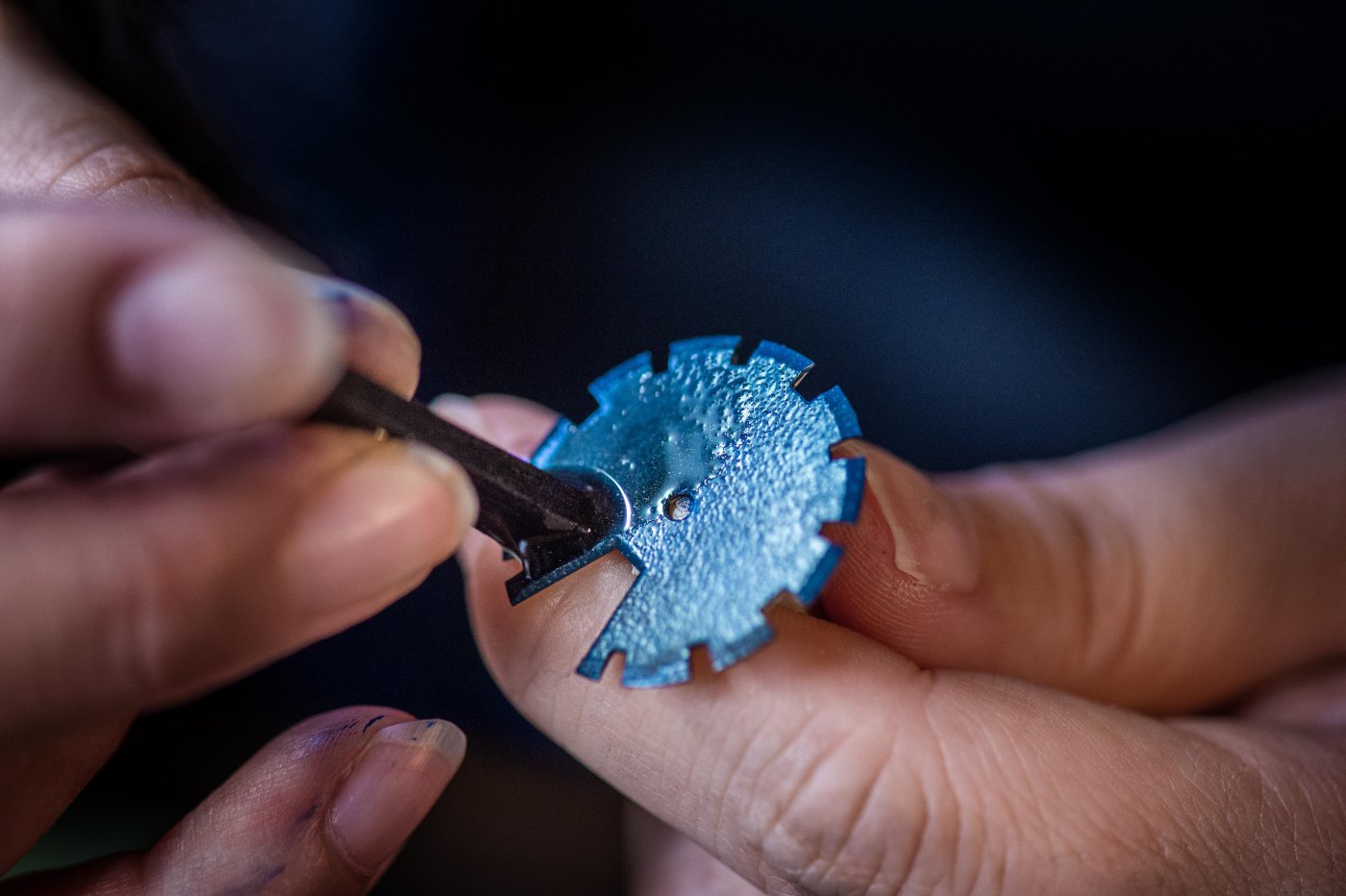 After blending and straining the Urushi, the copper base dial is painted with a first layer of lacquer. Then, the silver powder is applied, or sprinkled over it with the use of a special wooden tool. Owing to the strong adhesiveness of lacquer when it dries, the powder will remain and harden. Another layer of lacquer, a mixture of blue pigments and transparent Urushi is then applied acting as a seal. The process is repeated twice. After drying, the dials are polished several times enabling the silver powder to shine out. Thereafter, the dials are exposed to sunlight in order to bring out the color to its final shade. Lastly, the Minase logo will be printed.