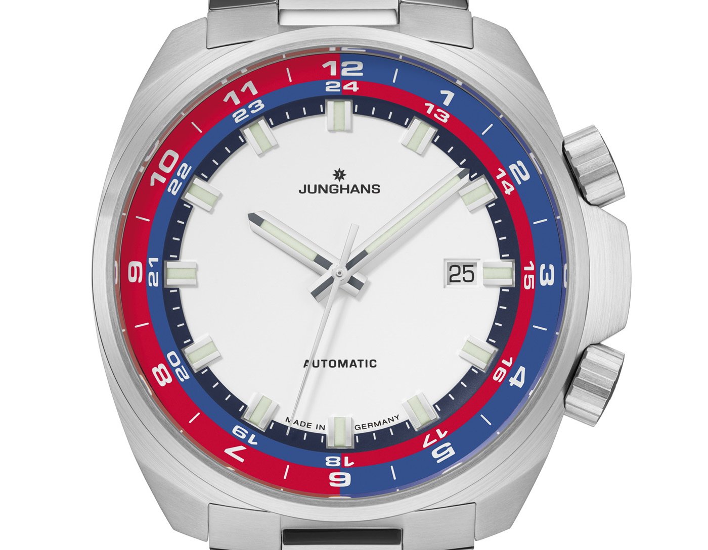 These characteristics outline the design of the 1972 Automatic Edition. Solid stainless steel, screwed crowns and a striking crown protection shape the athletic silhouette of the timepiece. The second time zone is displayed on the inner ring, rotatable to both sides and exhibiting the red and blue colouring of the event’s logo. A design feature which lends the watch it’s sporty dynamic, while at the same time symbolising the world wide interest for winter sports focussed spellbound towards Oberstdorf.