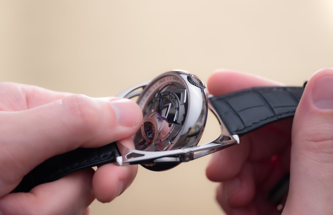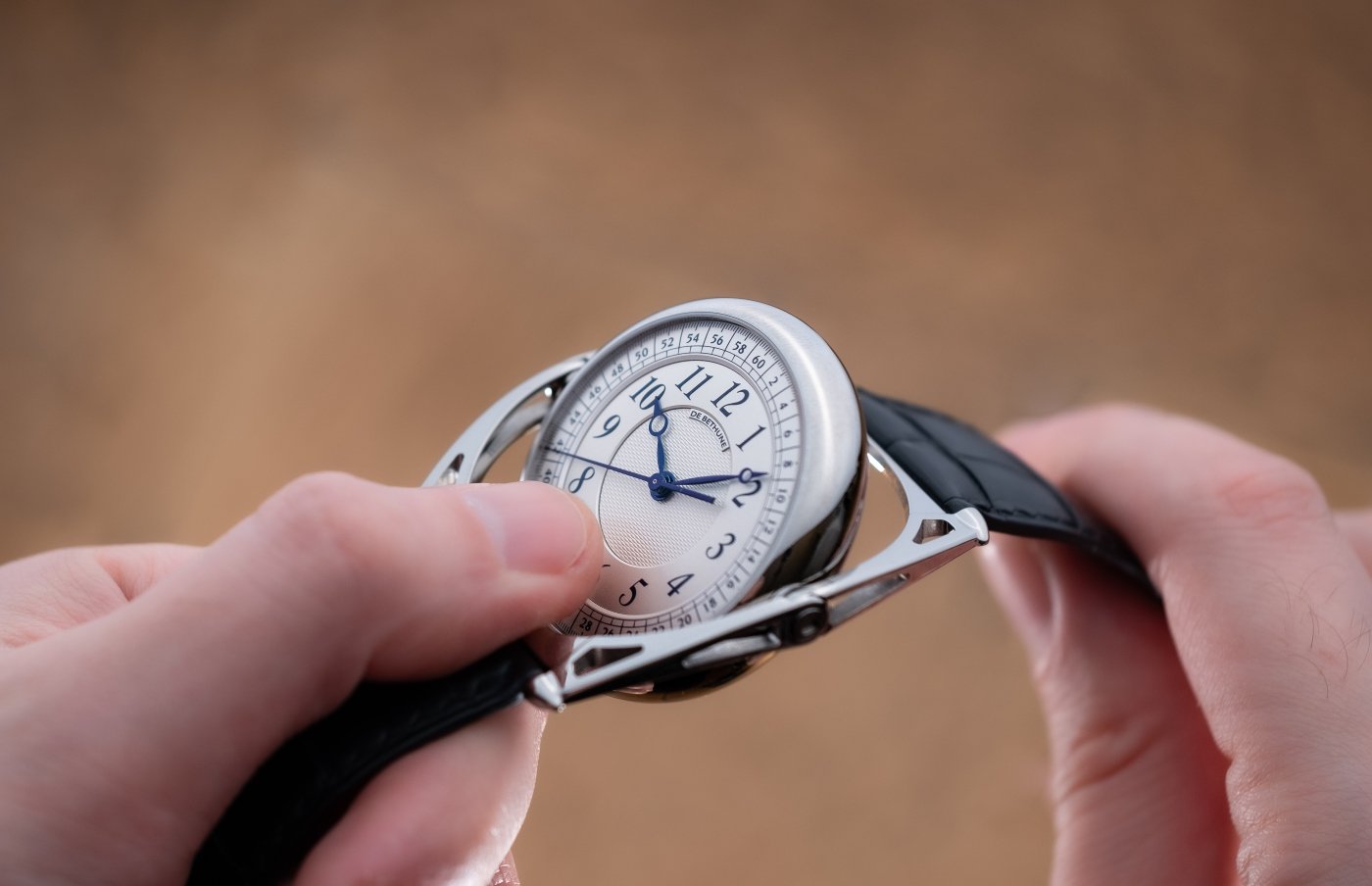 Thanks to a cam, a small “notch” allows the watch case to be instinctively and perfectly positioned in line with the floating lugs. The round case rotates on its central axis and can be positioned, front or back, in a delightfully easy, smooth and entirely natural way.