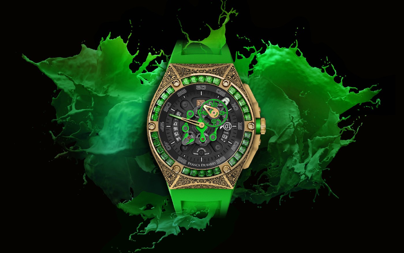 Franck Dubarry plays with materials and contrasts bringing together Bronze and Emeralds or pink Sapphires, Titanium and blue Sapphires. Bezels are set with 30 gems Baguettes cut, and the flying-hour of the dials comes with matching careful lacquered colors.
