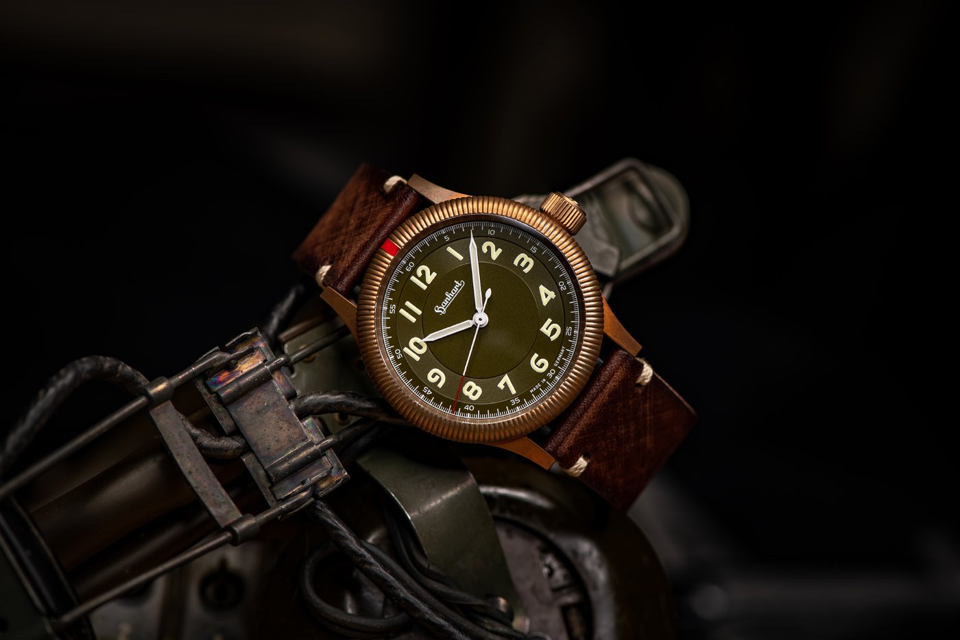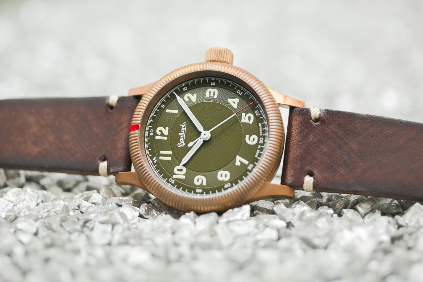 he legendary 417, the first pilot chronograph of the German Armed Forces in the 1950s, serves as the historical model. The warm bronze case paired with an olive green dial and a striking saddles leather strap give the watch a unique design.