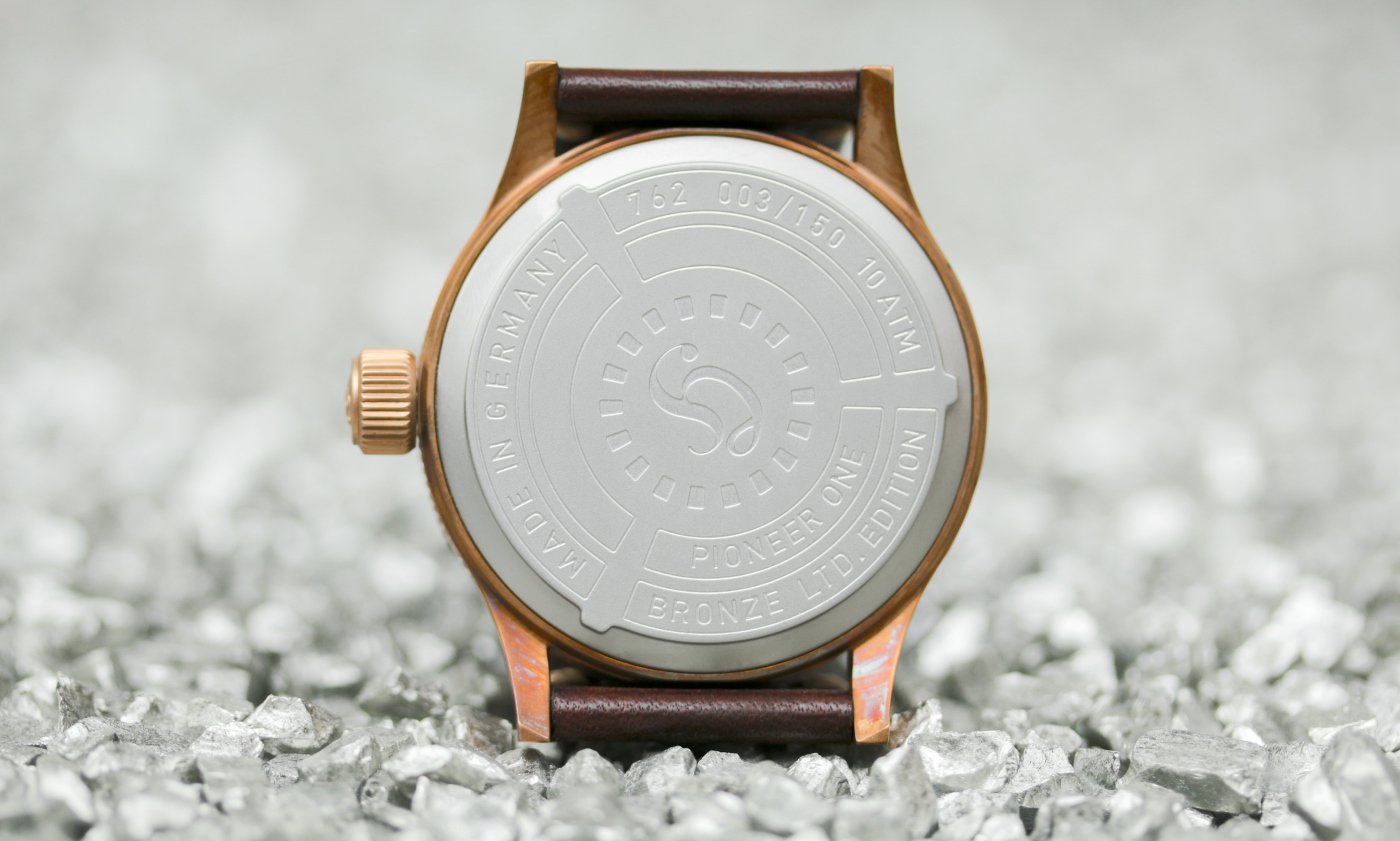The Pioneer One Bronze is limited to 150 pieces and each model will become uni-que with its own patina: the finely crafted case is made out of warm CuSn8 bronze with the exception of the case back which is manufactured in sandblasted stainless steel. By wearing the watch, an oxidation process is set in motion which changes the appearance of the case over time. External factors such as wearing habits and place of residence allow each Pioneer One Bronze to age individually in a fascinating way.