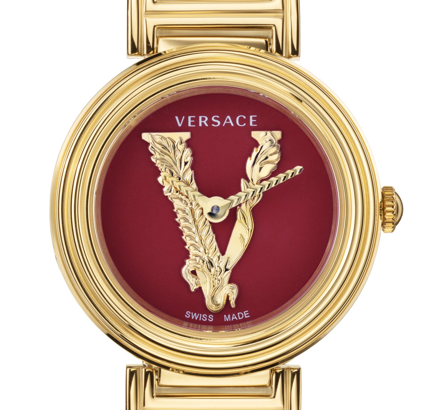 The Versace Virtus theme inspires the glamorous Mini Virtus Duo, whose look is characterized by a distinctive small round case and boasts the iconic V Virtus in relief on the red enamel dial.
