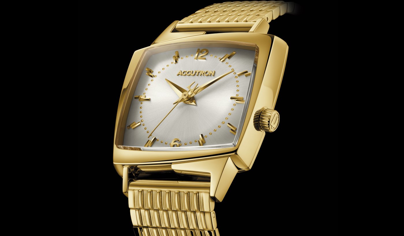 Destined to become a coveted timepiece again today, Accutron draws inspiration from this 1960’s original. Featuring the same visually distinctive asymmetrical case design and crown placement near 3 o’clock, the new 521 retains its original 32.8 x 32.5mm case dimension for unisex wearability today, but is offered with a gold-tone stainless steel case and mesh style bracelet with double-press deployant closure.
