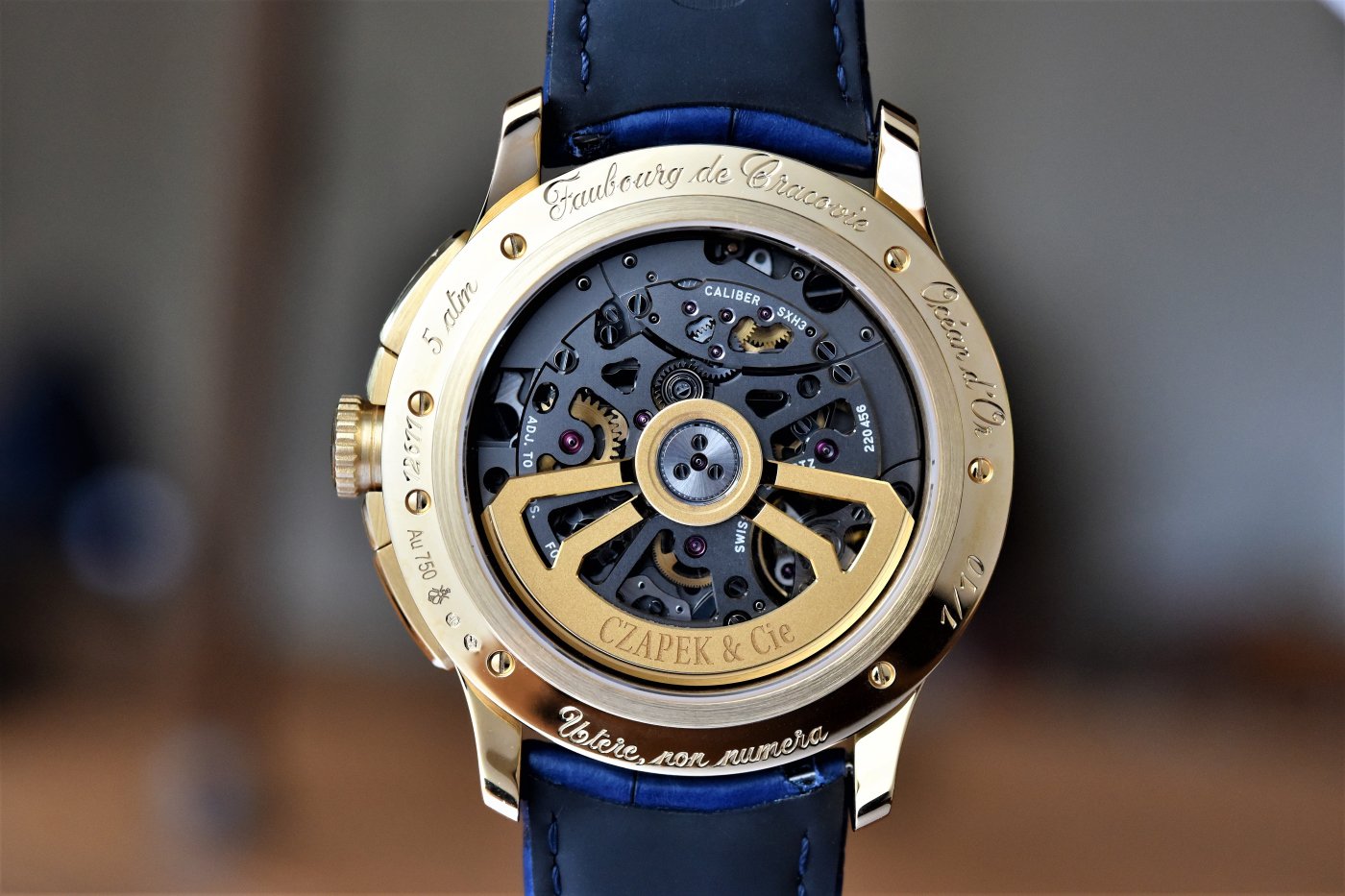 The Czapek SXH3 Caliber, driving the collection, is a COSC-certified, 5-Hertz bespoke automatic movement delivering 65 hours of power reserve from a single barrel. It makes use of some of the most advanced and effective mechanical elements, like a column-wheel, a one-piece linear reset hammer, and a vertical clutch. It is finely finished, with diamond-blasted anthracite bridges visible through the transparent case back.