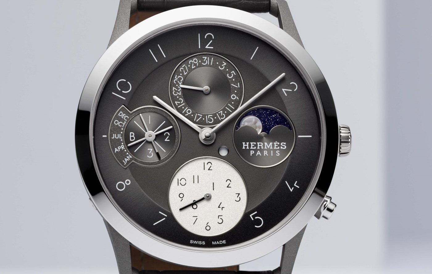 he Slim d’Hermès Quantième Perpétuel immediately draws the gaze. The numerals with their font specially designed by Philippe Apeloig stand out with light and airy grace. While the date, month, dual-time and leapyear indications are displayed on various counters, a mother-of-pearl moon phase graces an aventurine sky backdrop at 3 o’clock. The elegant and graphic dial melts seamlessly into the surrounding precious rose gold and titanium or titanium and platinum case.