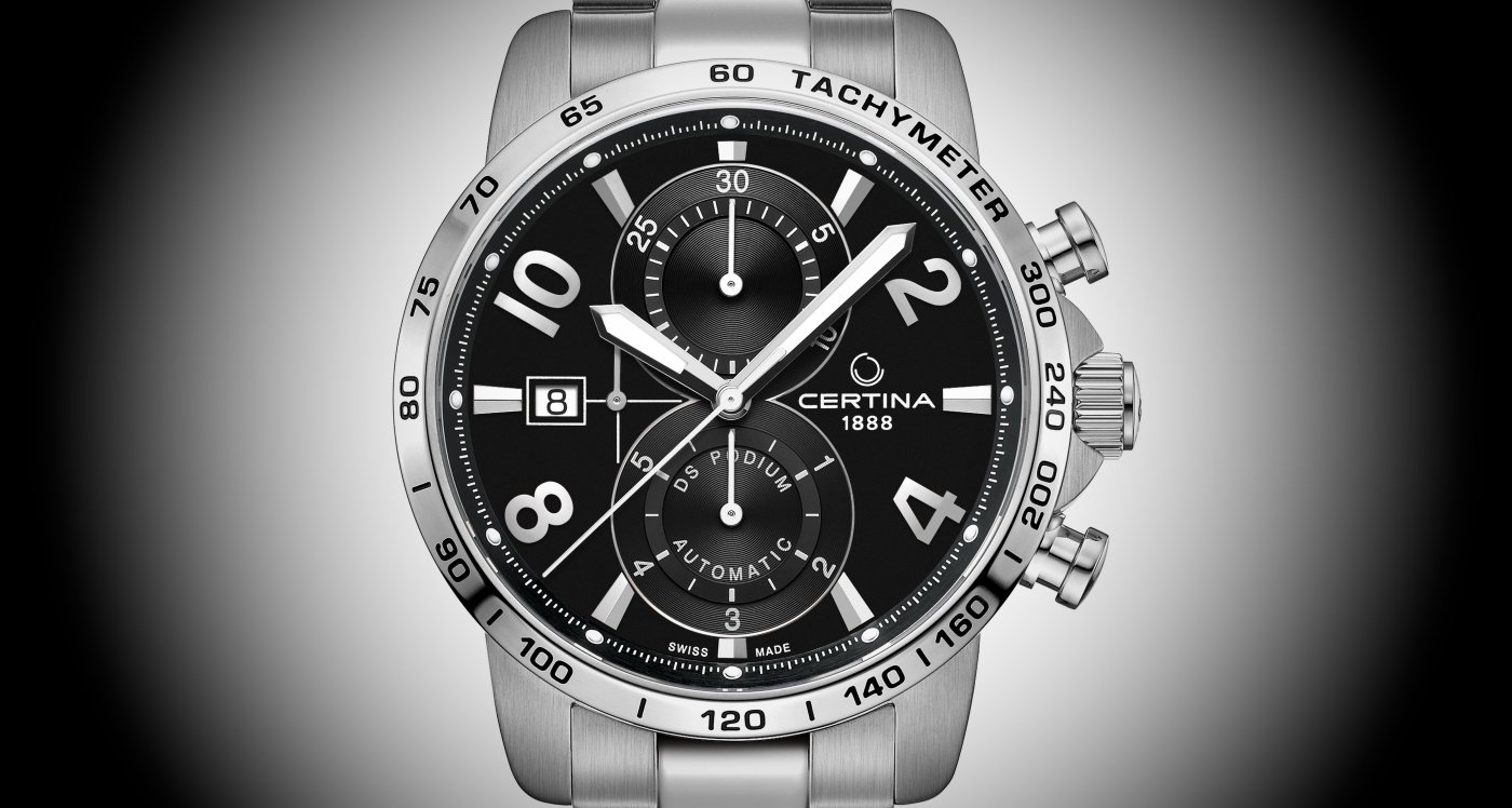 The DS Podium is a classic Certina sports watch. In its newest incarnation it enriches the collection with an especially contemporary look: the 44 mm stainless steel case frames a grey dial enhanced with a sunburst finish.