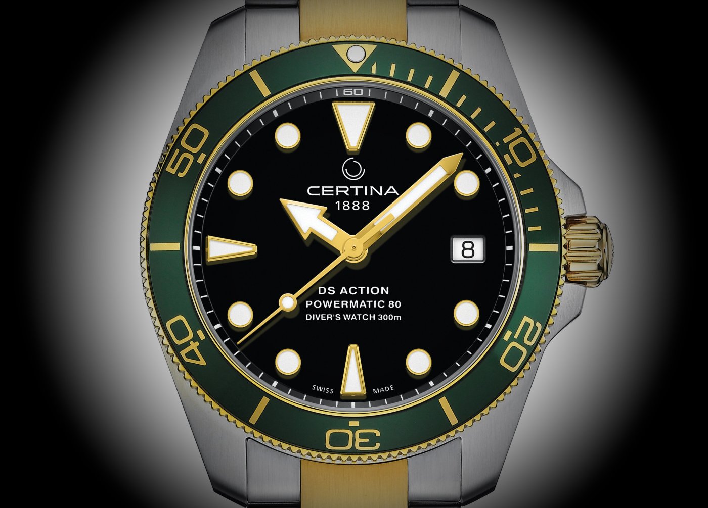 The black lacquered dial sets off gold-coloured, SuperLumiNova-coated hour markers and hands, which guarantee clarity in the dark as well. They are framed by a unidirectional rotating bezel in emerald green aluminium with a gold-coloured dive time scale and luminous marking. A bicolour stainless steel bracelet with gold-coloured PVD links and a closure with diver’s extension round off this model.