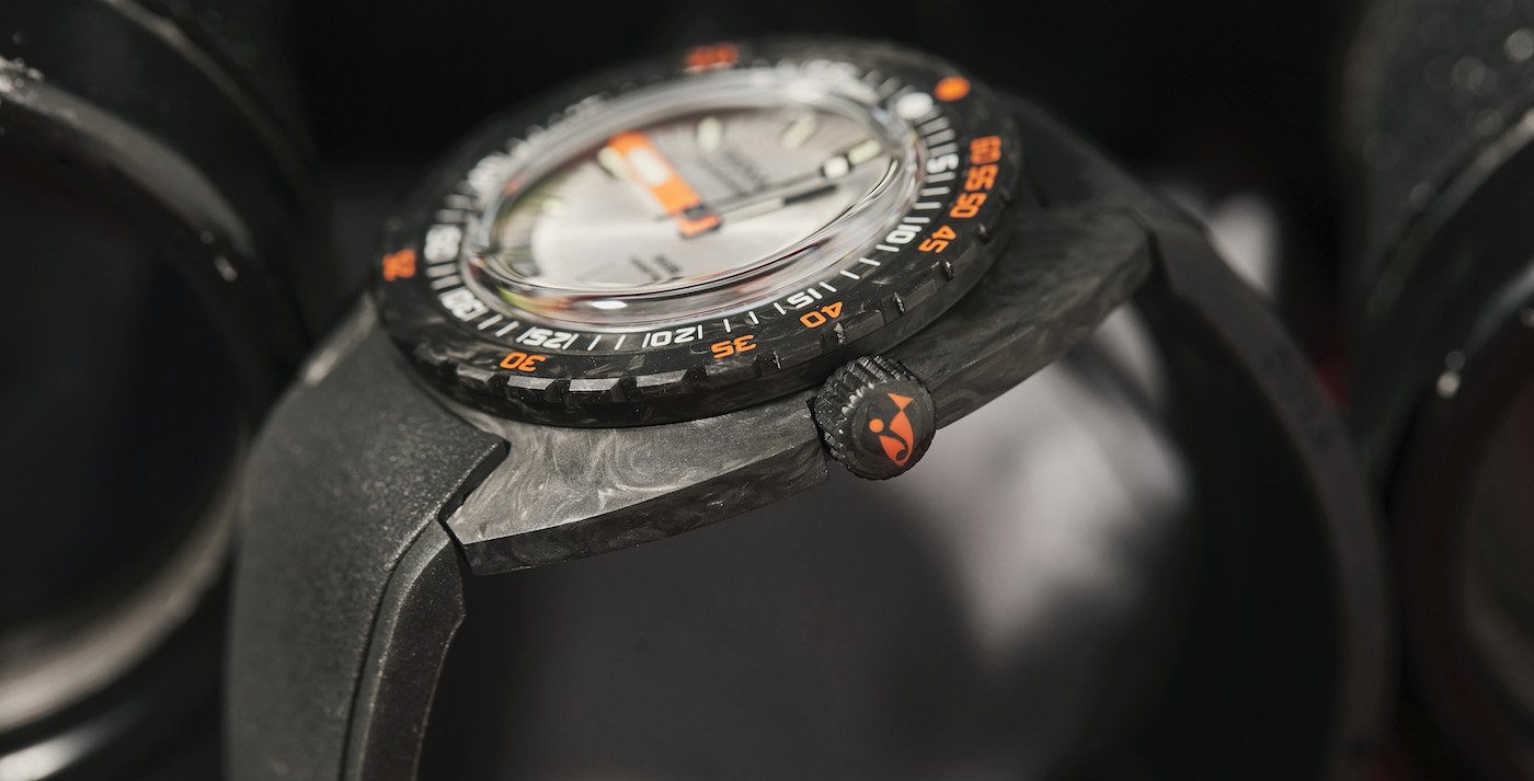 Bezel Forged carbon, black – Unidirectional rotation Outer ring: Diving depths in meters (either orange, yellow or turquoise), Super-LumiNova® dot at 12 o’clock Inner ring: Diving times in minutes (white), dot at 12 o’clock