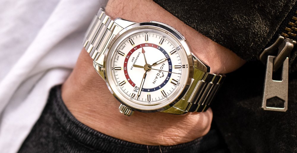 The Freedom 60 GMT Opaline features a robust stainless-steel case and an understated white opaline dial. A highlight of its design is Norqain’s instantly recognizable take on the GMT scale on a centre ring that has already made the collection such a hit with watch aficionados. With this model, a bordeaux red half-ring from 6:00 (6 a.m.) to 18:00 (6 p.m.) indicates the daytime hours and a midnight blue half-ring from 18:00 (6 p.m.) to 6:00 (6 a.m.) is dedicated to the night time. With the GMT scale and a central red-tipped GMT hand that rotates the dial once every 24 hours, wearers can easily track the time in a second time zone.
