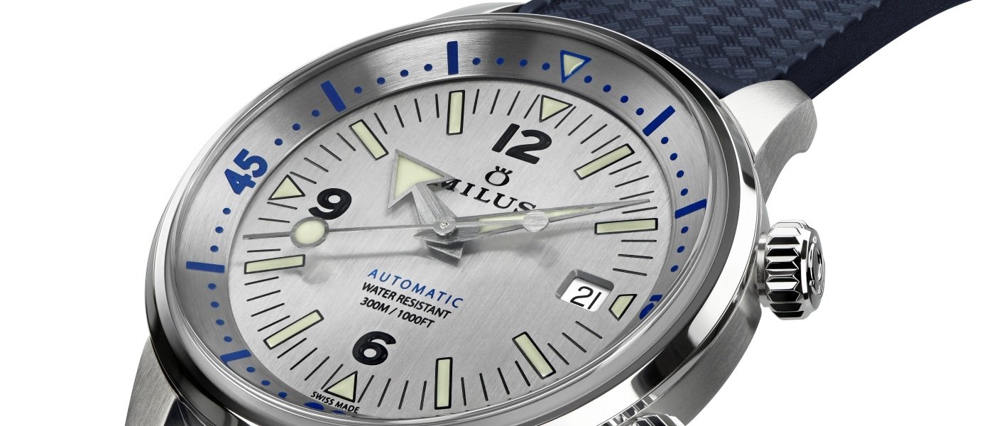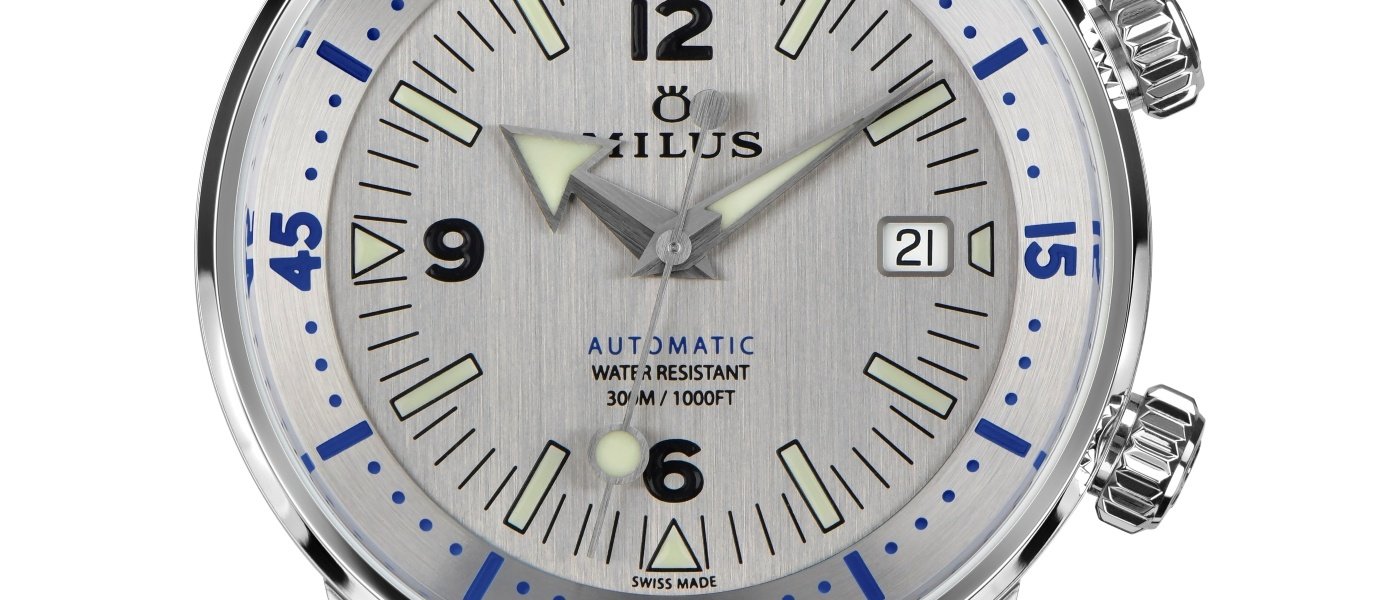 A stunning vertical brushed silver dial features a bi-directional circular brushed inner diver bezel with royal blue accents. All markings are executed in natural Super-LumiNova® for accurate timekeeping in all conditions. Traditional «Broad Arrow» hands with brushed gun metal finish and filled with natural Super-LumiNova®