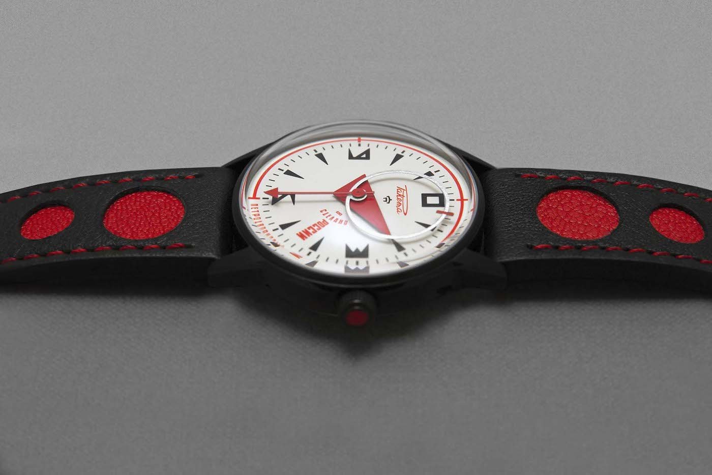 The dial has a strong avant-garde graphic design, in particular with the words “Made in Russia” written in its center in the style of a slogan. The black leather strap has large circular openings along its length revealing the red linen usually hidden under the upper strap material. The automatic movement, entirely produced at the Raketa Watch Factory, is decorated with an avant-garde design printed not only on the rotor but also on the main bridge using a printing technique rarely used in watchmaking.