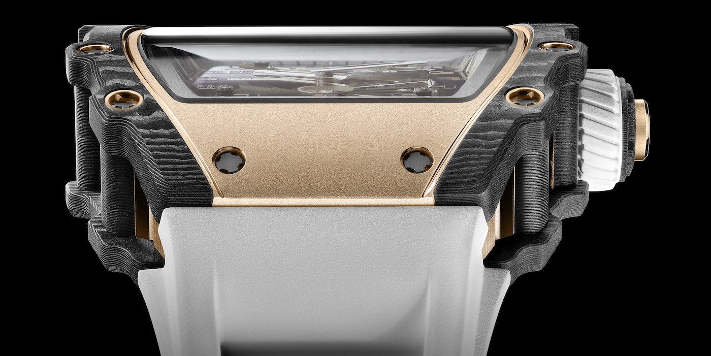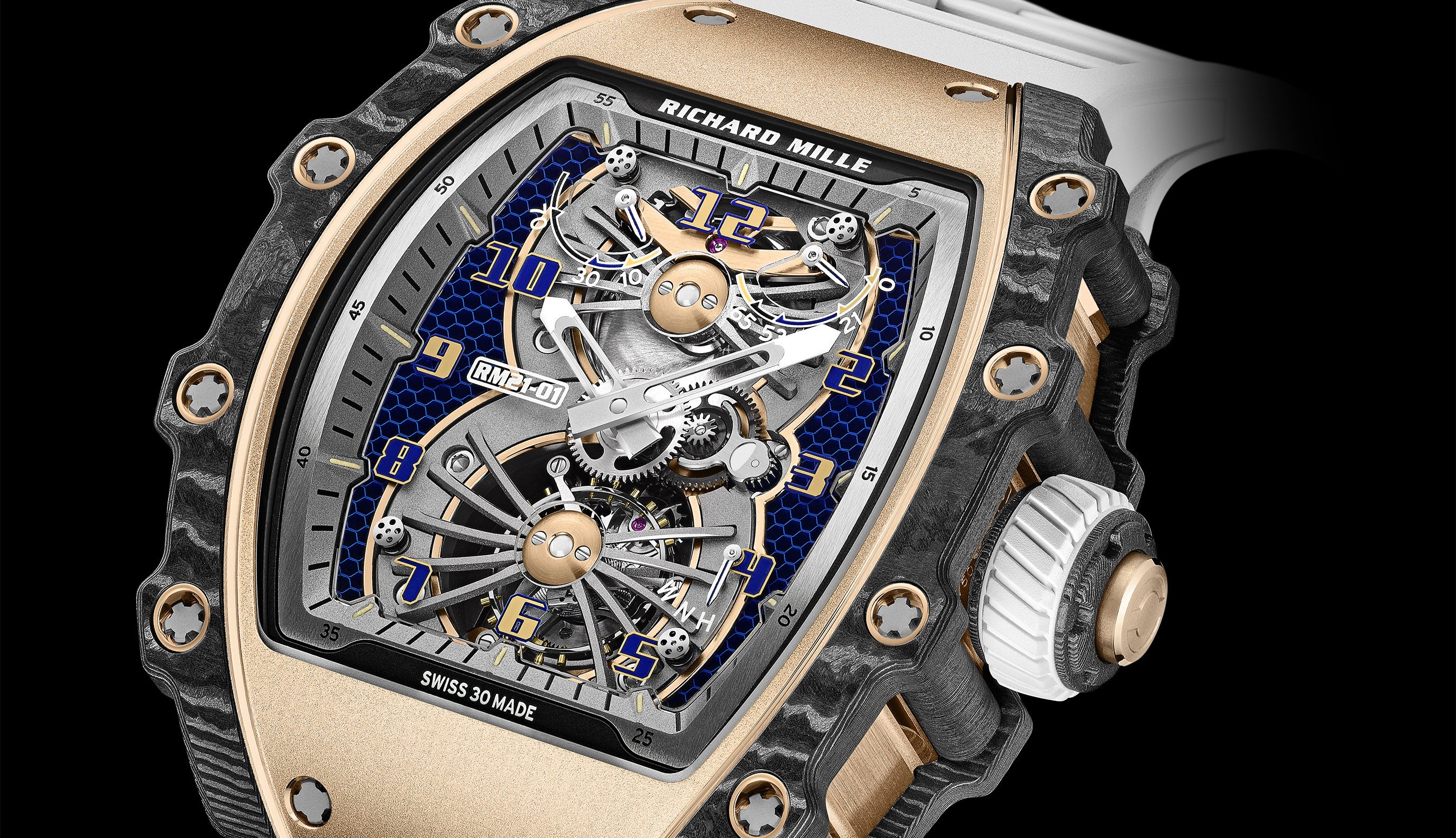 With the RM 21-01, Richard Mille presents a new case design. The complex structure of the case in 5N red gold is reinforced with an exoskeleton in Carbon TPT®, used for the bezel and pillars. This extremely light and durable composite is made by stacking hundreds of layers of carbon fibres