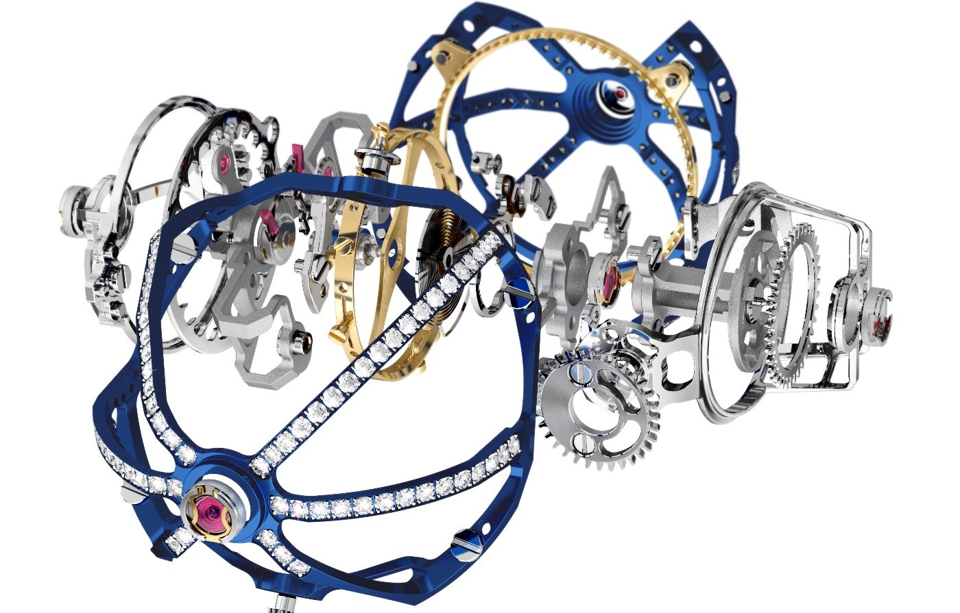 - MOVEMENT Mechanical Hand Winding Caliber CP03 Double Spherion with Diamond Set Cages – the World’s Fastest Double Triple Axis Tourbillon; called “Spherion” by its inventor, the Master watchmaker Eric Coudray (winner of the watchmaking Gaïa Prize in 2012) Functions: Hour, Minute and Power Reserve Indication via an Ingenious Suspended Mobile Cone Mainspring Sensor Number of Components: 386 Number of Jewels: 67 Power Reserve: 32 hours 6 Mainsprings Assembled in 4 barrels Aligned in Parallel (Four are Superimposed within Two Barrels). 2 Visible Barrel Covers Engraved. Balance Frequency: 3Hz / 21,600 bph Torque: 32 newtons / mm Movement Dimensions: 37.5 mm x 13.3 mm Movement Weight: 15.7 grams Adjusted to all positions Sapphire bridges: sapphire Power reserve bridge, sapphire hour geartrain bridge, sapphire dial bridge High-Velocity Spherion Cages Performance based on a Potter escapement re-visited by Eric Coudray Both Cages are Revolving in the Opposite Direction Thanks to its Differential System Fastest Triple-Axis Tourbillon with Rotation in: ⇒ 8 Seconds Inner Cage ⇒ 16 Seconds Secondary Cage ⇒ 30 Seconds Outer Cage Spherion Weight: 0.831 grams Material: Blued Titanium Setting: 304 brilliant-cut Diamonds in total 3 Shock Protection: 8 Incabloc