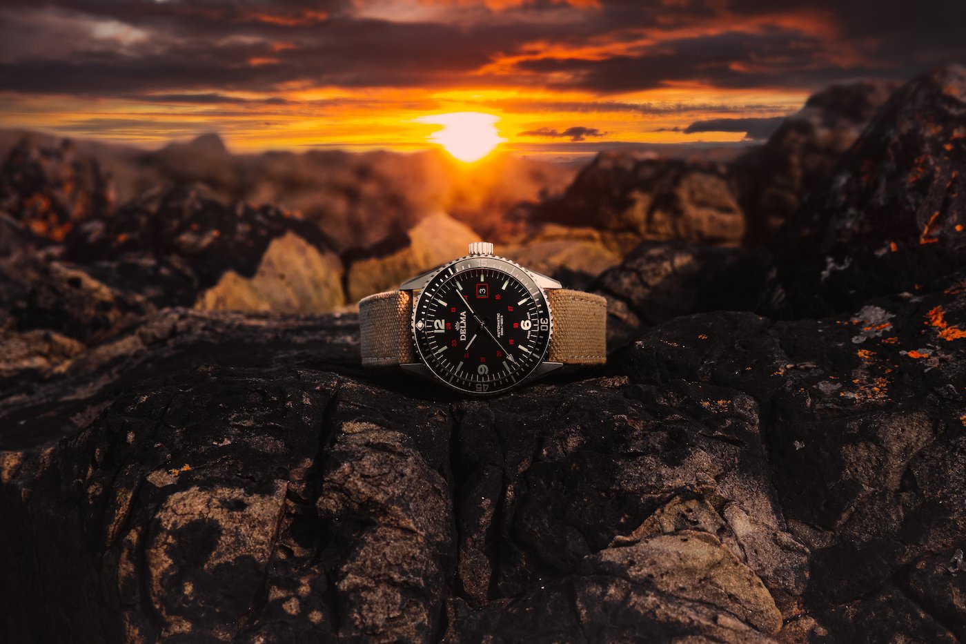 The Field is an expansion of the Cayman collection which is built upon the design of a 1970s Delma divers’ watch. Extreme functionality of the new edition is apparent with bold luminous numerals set against a solid black dial. A red 24-hour track makes military time easy to register and adds a compelling design element.