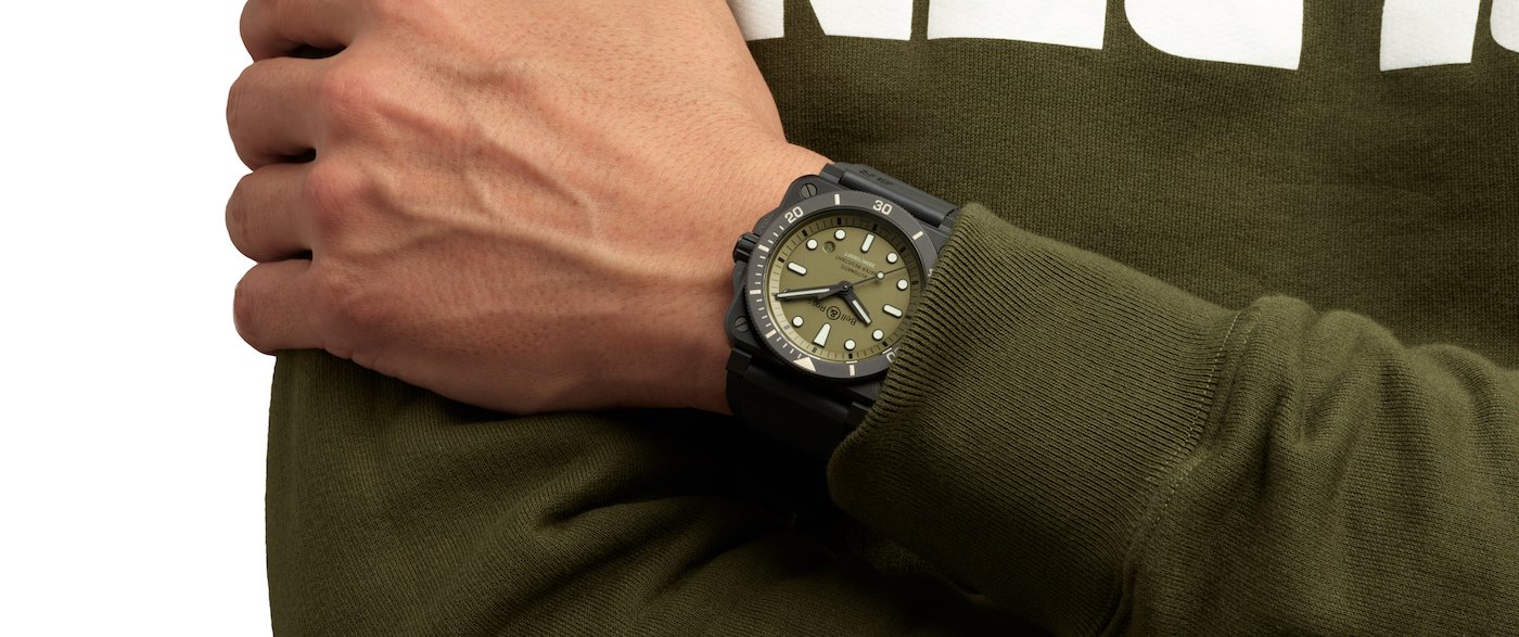 With its olive drab tone, the BR 03-92 Diver Military mirrors the color of the military uniform of these men for whom discretion is the ultimate priority while in mission, and makes it a superbly camouflaged watch.