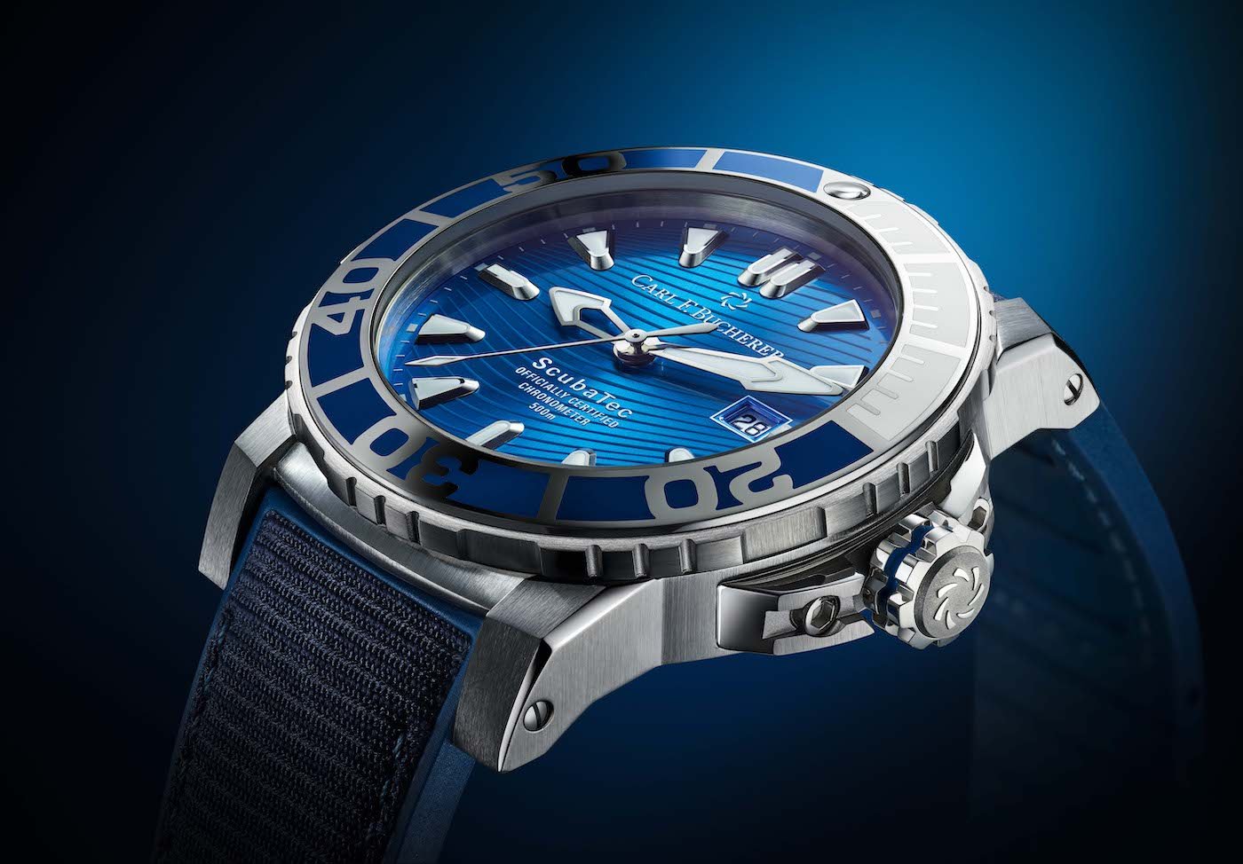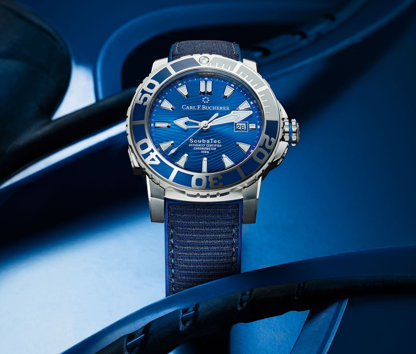 This stunning dive watch is presented on a unique blue strap made of natural rubber; its fabric insert is made of 100% recycled bottles recovered from the Mediterranean Sea, underscoring Carl F. Bucherer’s love of the sea and its creatures. The strap is fitted with a finely adjustable diving folding clasp that extends the length of the bracelet so that it will close comfortably around a diving suit. The Patravi ScubaTec Maldives is also available with an optional stainless-steel bracelet, also with a diving folding clasp. Like the strap, the bracelet features a fine adjustment function, which means that it can be extended to precisely the length the wearer desires.