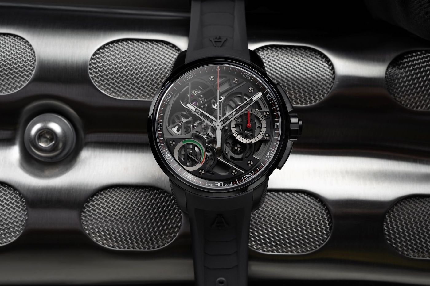 The openworked movement has 350 components in total, is treated with black DLC and accentuated in grey. The design is an expression of Angelus’ own brand of hyper-technicality; it is the supreme sportiness of an ultra-light split-second chronograph. One-of-a-kind mean machine.