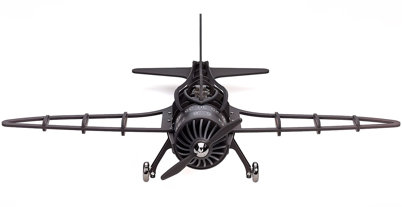 - Manual winding by counterclockwise rotation of the engine’s radiator at the front of the clock, just behind the propeller.