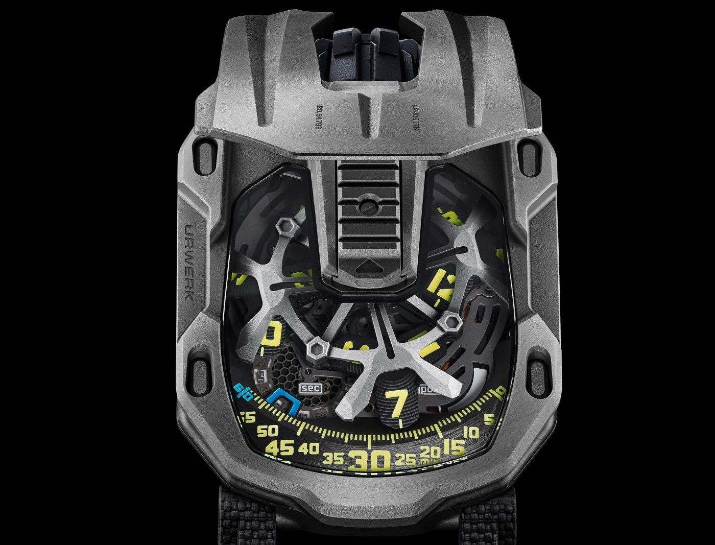 Activating the sliding “tongue” of the UR-105 TTH opens the hull to reveal its mechanics, featuring a satellite time indication built on a new skeleton carousel. The latter supports four hour satellites, each displaying three hour numerals that rotate in turn along the minute track, providing both analog and digital time displays.