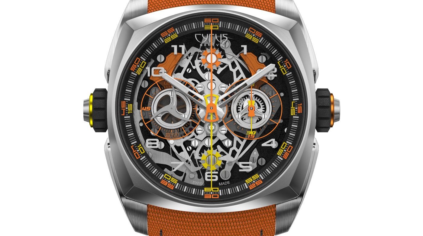 • Cushion-shaped case made of 26 parts in polished/satin-brushed grade 5 titanium • Diameter: 42 mm excluding the crowns • Thickness: 16.5 mm • Crown at 3 o’clock: position 1 to wind the movement; position 2 to adjust time + pusher for activation of chronograph No. 1 (start-stop-reset) • Crown at 9 o’clock: pusher to activate chronograph No. 2 (start-stop-reset) • Decoration of crowns: engraved Cyrus logo, black rubber ring embossed with grooves and orange anodised aluminium ring on crown at 3 o’clock corresponding to chronograph No. 1; yellow anodised aluminium ring at 9 o’clock corresponding to chronograph No. 2 • Sapphire crystal on dial side: anti-reflective treatment on both sides • Case back: sapphire crystal, sealed with customised screws with Cyrus, engraved with the logo • Water-resistance: 10 ATM (100 m – 330 ft)