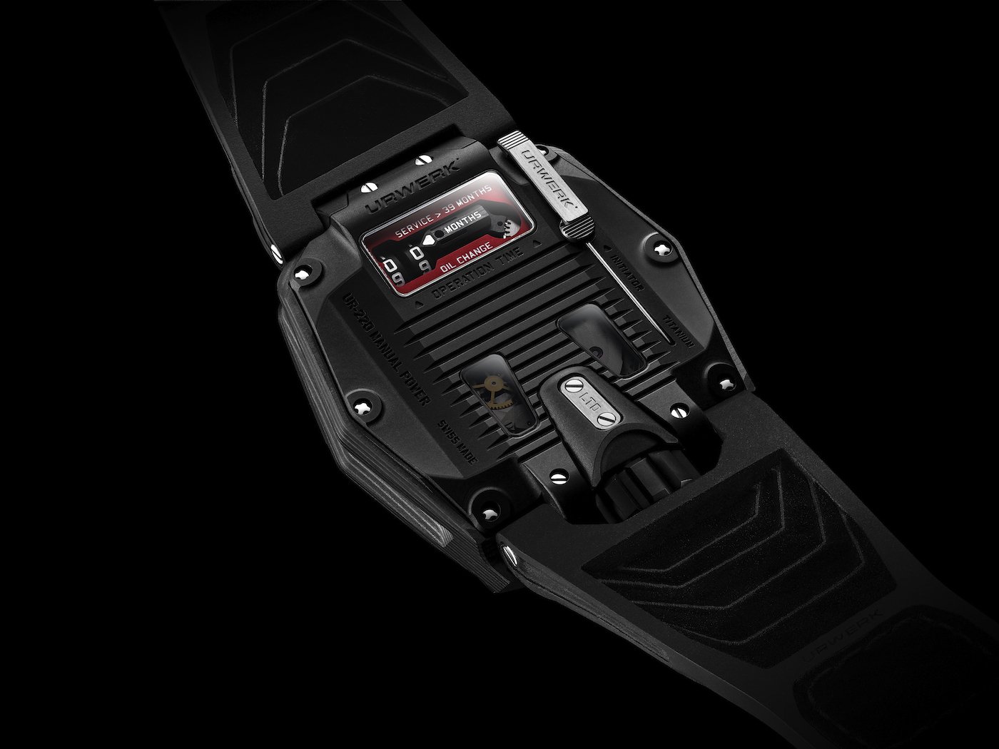 The back of the UR-220 SL Asimov features a digital Oil Change gauge appearing on two adjacent rollers. The wearer of the watch triggers this device by removing a protective pin and pressing a pusher to activate the counters that will display the mechanism’s active running time in months. After 39 months – three years and three months – a service is recommended and once this is complete, the Urwerk teams reset the counter and replace the pin.
