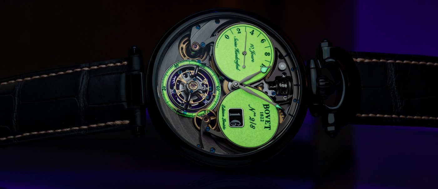 Over the past few years, Bovet has been integrating Super-LumiNova into its timepieces in unique ways – in the lunar surface of the moon phase, on the sunshine dials of various collections – but this is the first time that Super-LumiNova has been applied so strongly onto the dials, a true statement of modernity.