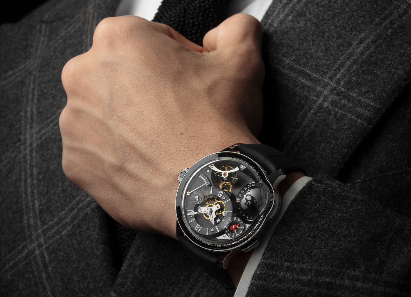 DIAL Multi-level hour-ring in synthetic sapphire, galvanic growth hour indexes, engraved and lacquered minutes and small seconds • Power-reserve and GMT indicators in gold, engraved and lacquered, circular-grained, black treatment • Rotating globe with day-and-night UTC indicator in synthetic sapphire, engraved and lacquered