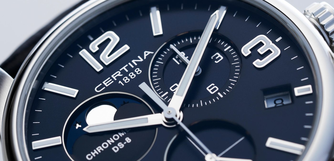he chronograph and moon phase provide everyday functionality – and are real eye-catchers at the same time. In the new Certina DS-8 model, these complex features are presented clearly within a harmonious and attractive design.