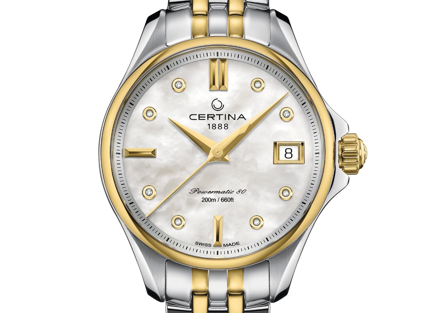 he Powermatic movement in the new Certina DS Action Lady features both a low-stress 80 hours of power reserve and an anti-magnetic NivachronTM balance spring. Sparkling diamonds offer understated glamour, while the watch’s robust workmanship and water resistance to 20 bar (200 m) render it perfectly equipped for all the adventures of everyday life.