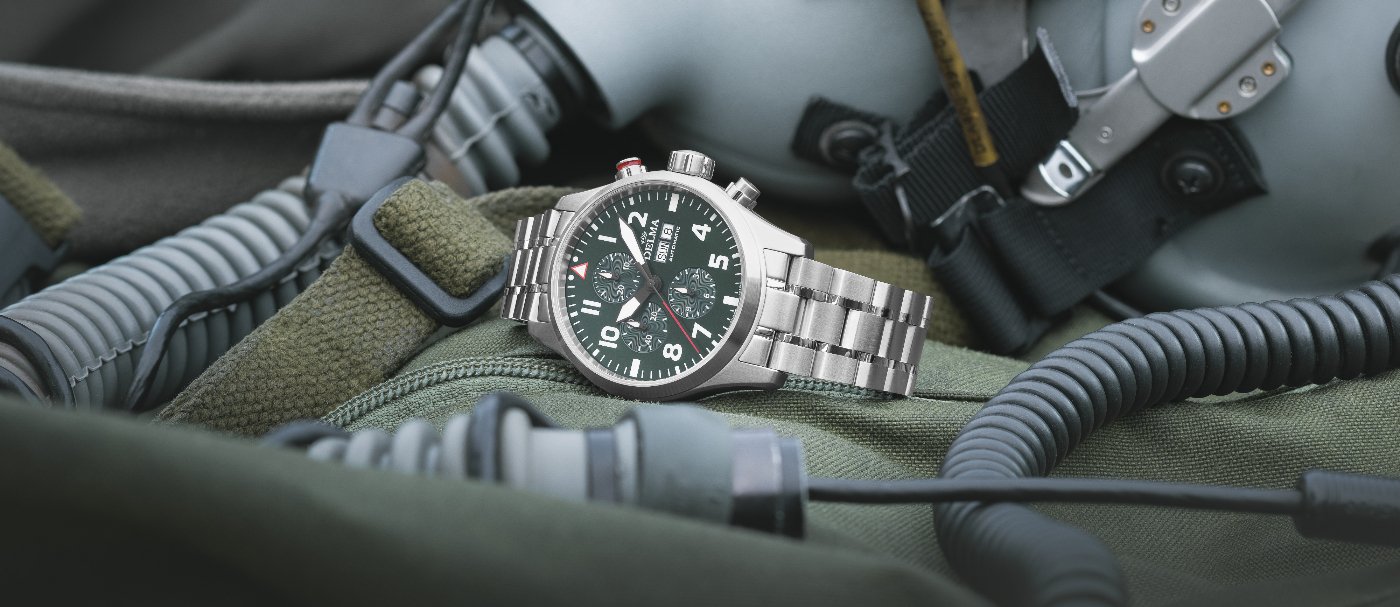 The addition of navy blue and green sunray brushed dial options mounted on a stainless steel bracelet exude a more formal appearance for elite aviators and intrepid explorers. The new big date and chronograph models are accentuated with red details on the zero index triangle while the original and new three hand models highlight the date with a red arrow and contrasting white backdrop. The big date models are powered by an ETA 2892A2 movement with a Jaquet 3512 Big Date module with its 50-hour power reserve sufficient to fly across the globe.