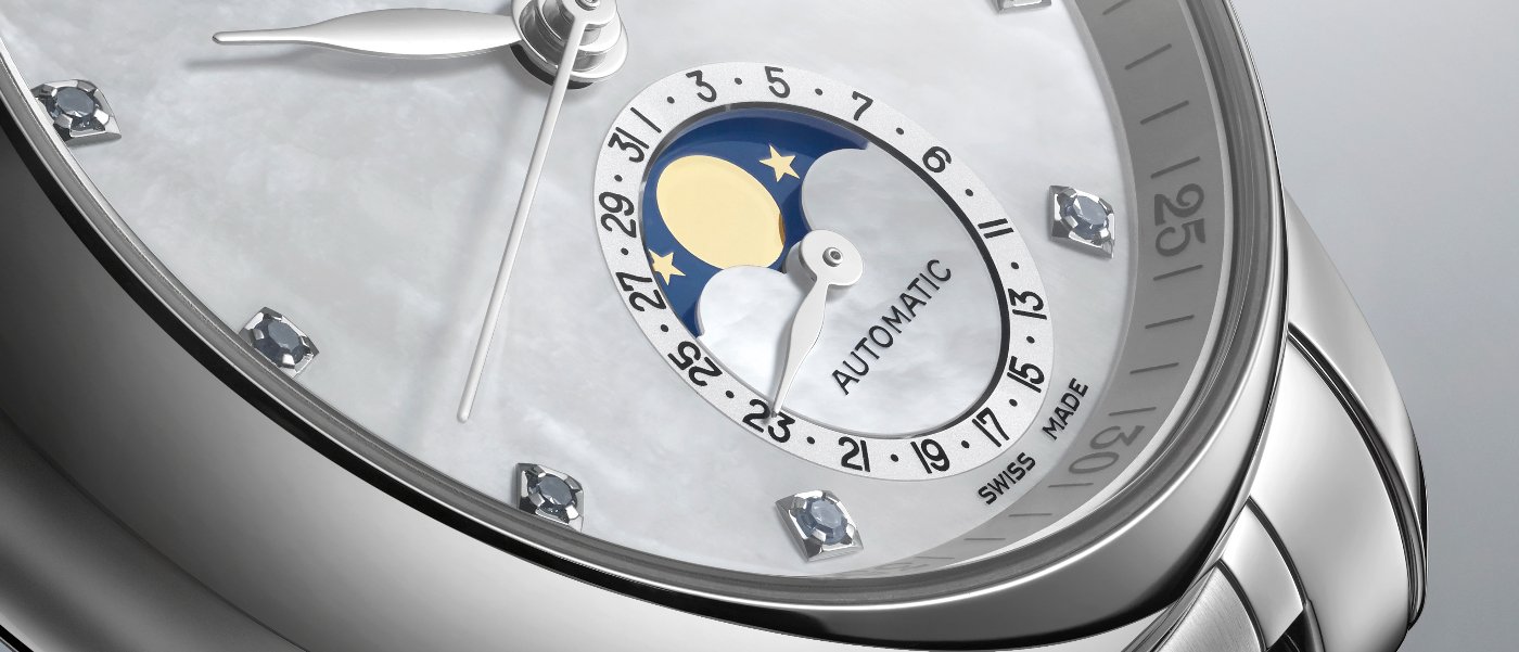 On the visible side, the mother-of-pearl dial rivals the diamond hour markers in subtlety. It is also available in sunray blue, and purists will appreciate the now classic and unmistakable silver “barleycorn” pattern, emblematic of The Longines Master Collection.