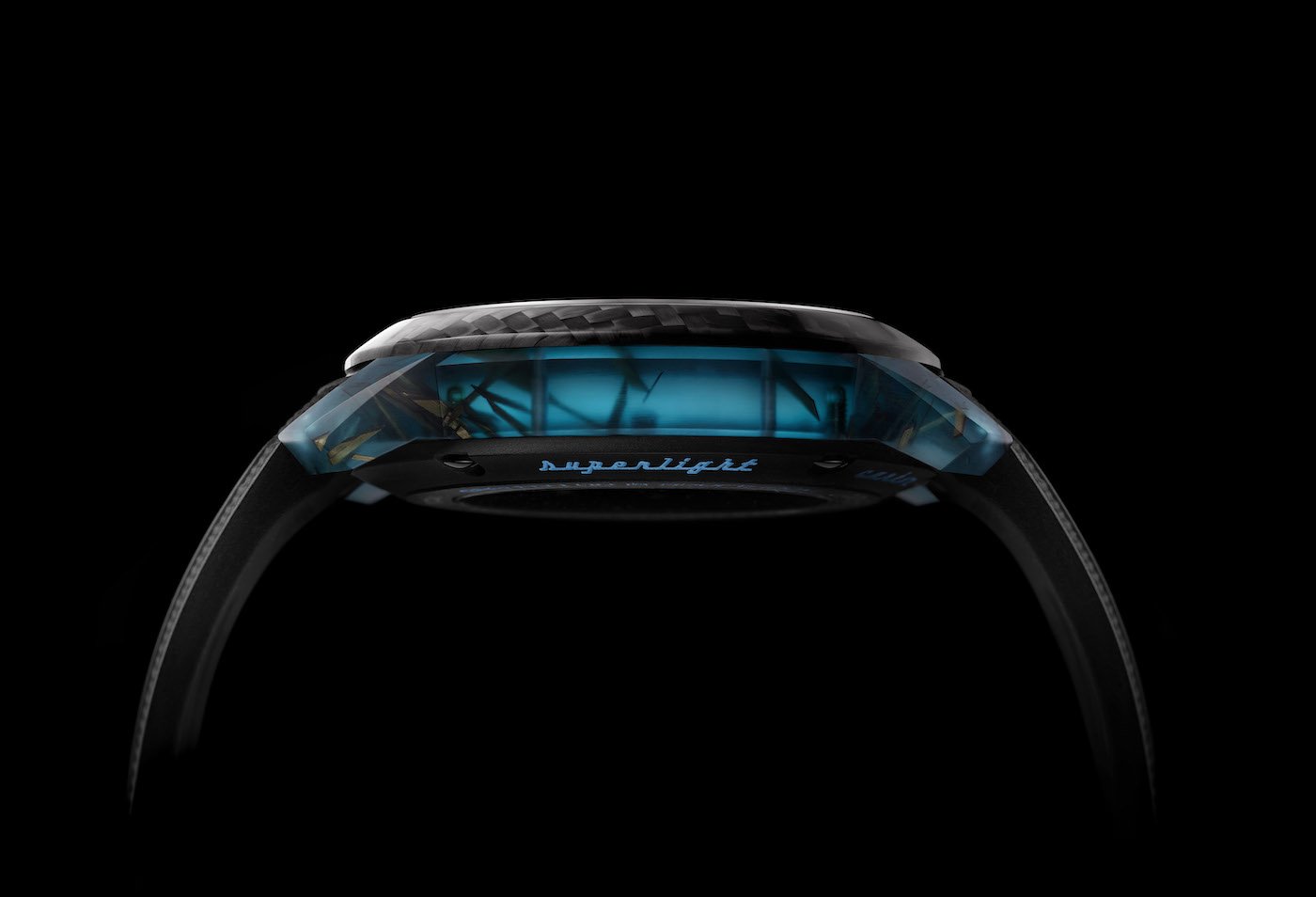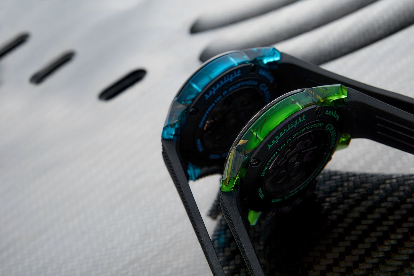 raham’s new Superlight Carbon Skeleton weighs less than 100 grams. Despite having a low mass, the model’s torso remains remarkably strong. The luminescent case is formed of epoxy resin, infused with a blue or a green dye while the movement holder is amplified by blue or green Super-LumiNova. Within its structure are metallized carbon fibers, presented in bronze tones, bestowing contrast.