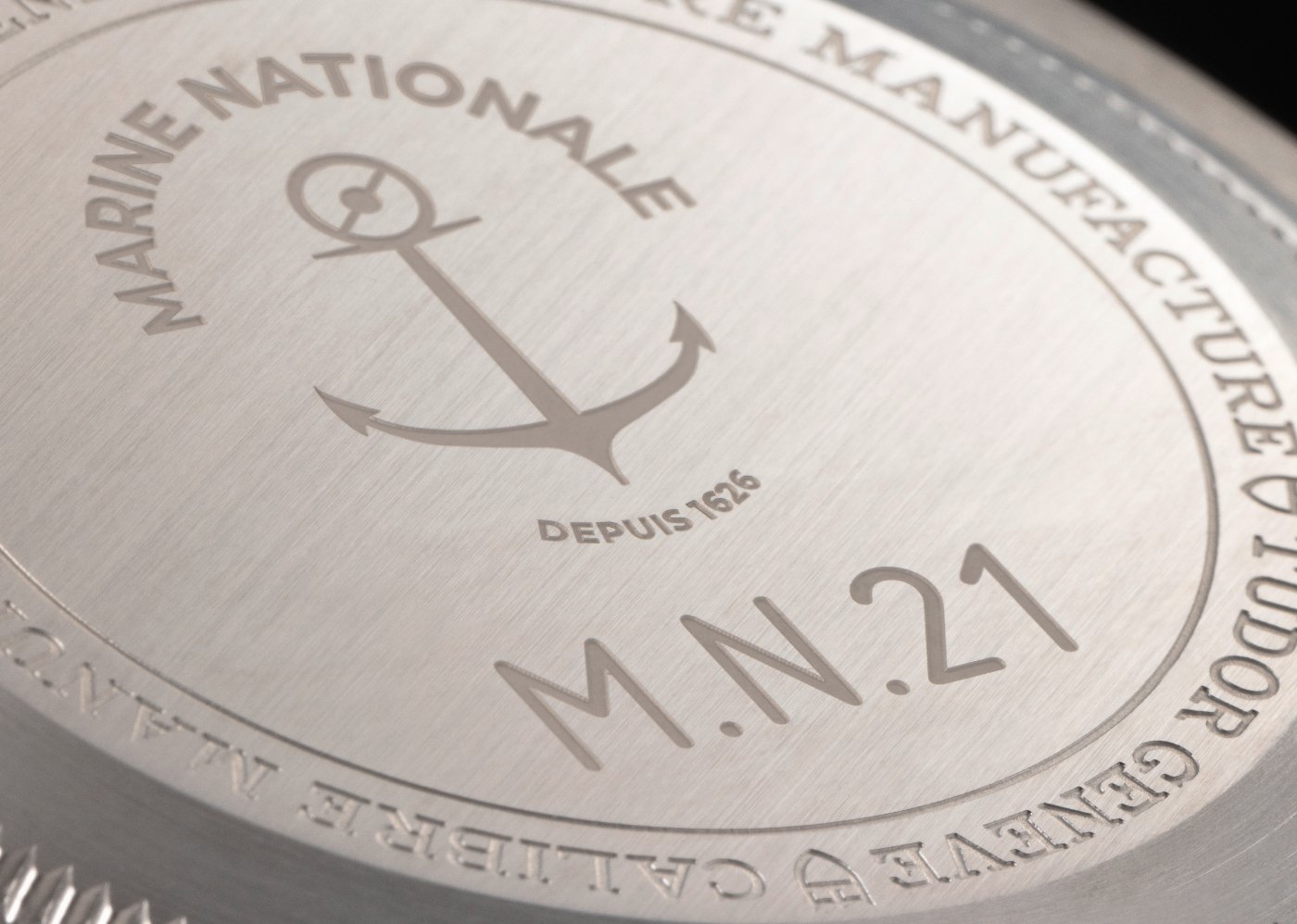 1. 42 mm satin-brushed titanium case with fixed strap bars, machined from a single block, and case back engraved with the Marine nationale (French Navy) logo and the inscription “M.N.21” (Marine nationale 2021), inspired by the original engravings of the 1970s and 1980s.