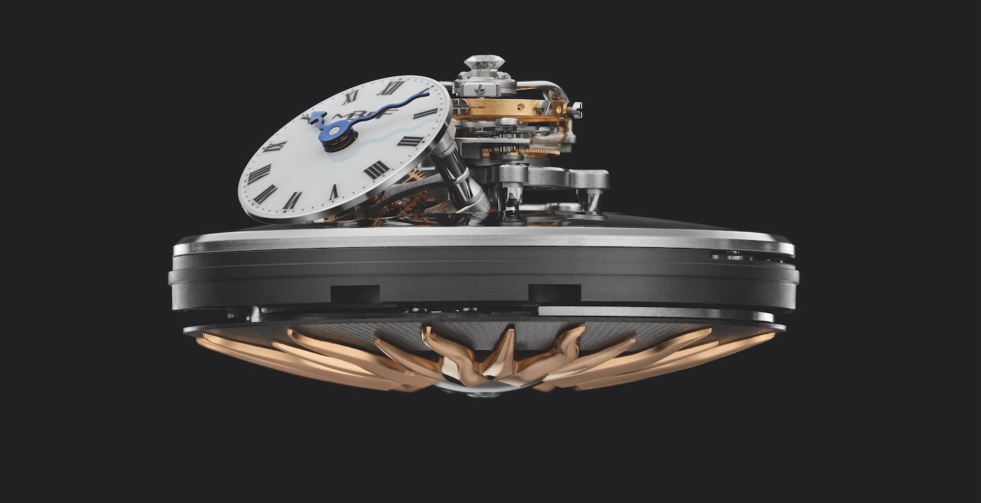 - MB&F FlyingT movement featuring three-dimensional vertical architecture, automatic winding, conceived and developed in-house.