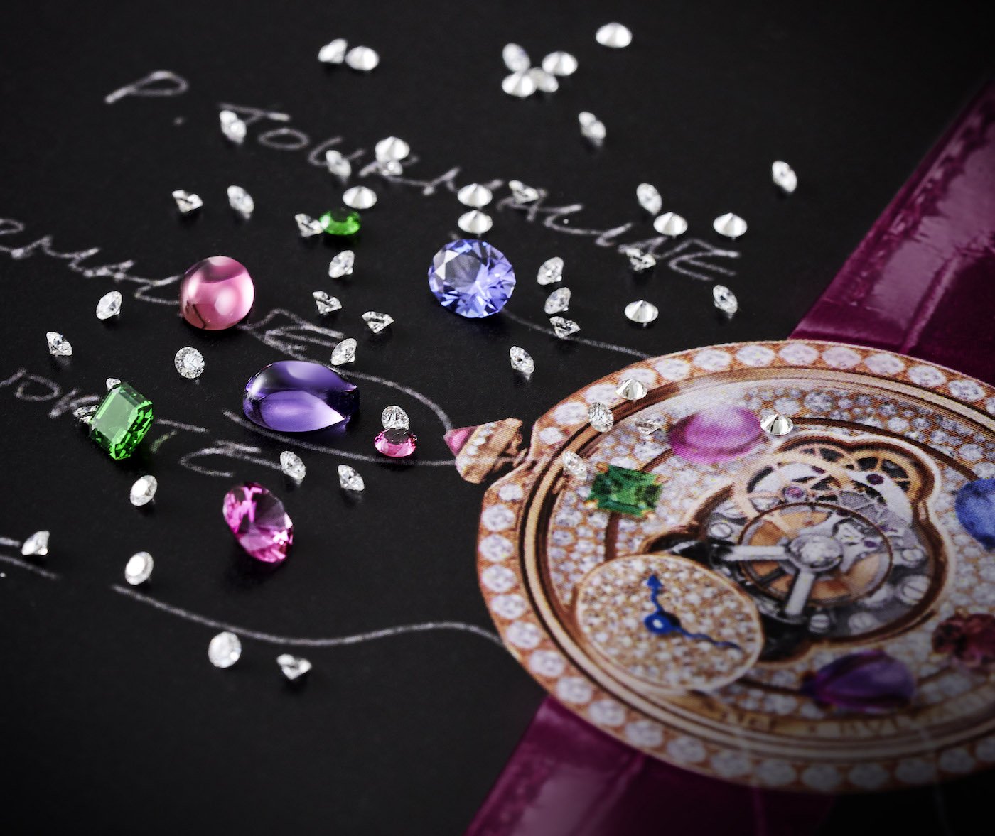 For the rose gold version: • Brilliant-cut diamonds on the dial and crowns: 0.24ct • Brilliant-cut diamonds on the case and buckle: 2.80cts • 2 tsavorite square and round: 0.38ct • 2 tourmaline oval and round: 0.64ct • 1 oval tanzanite: 0.47ct • 1 pear amethyst: 0.70ct • 1 round rubellite: 0.39ct