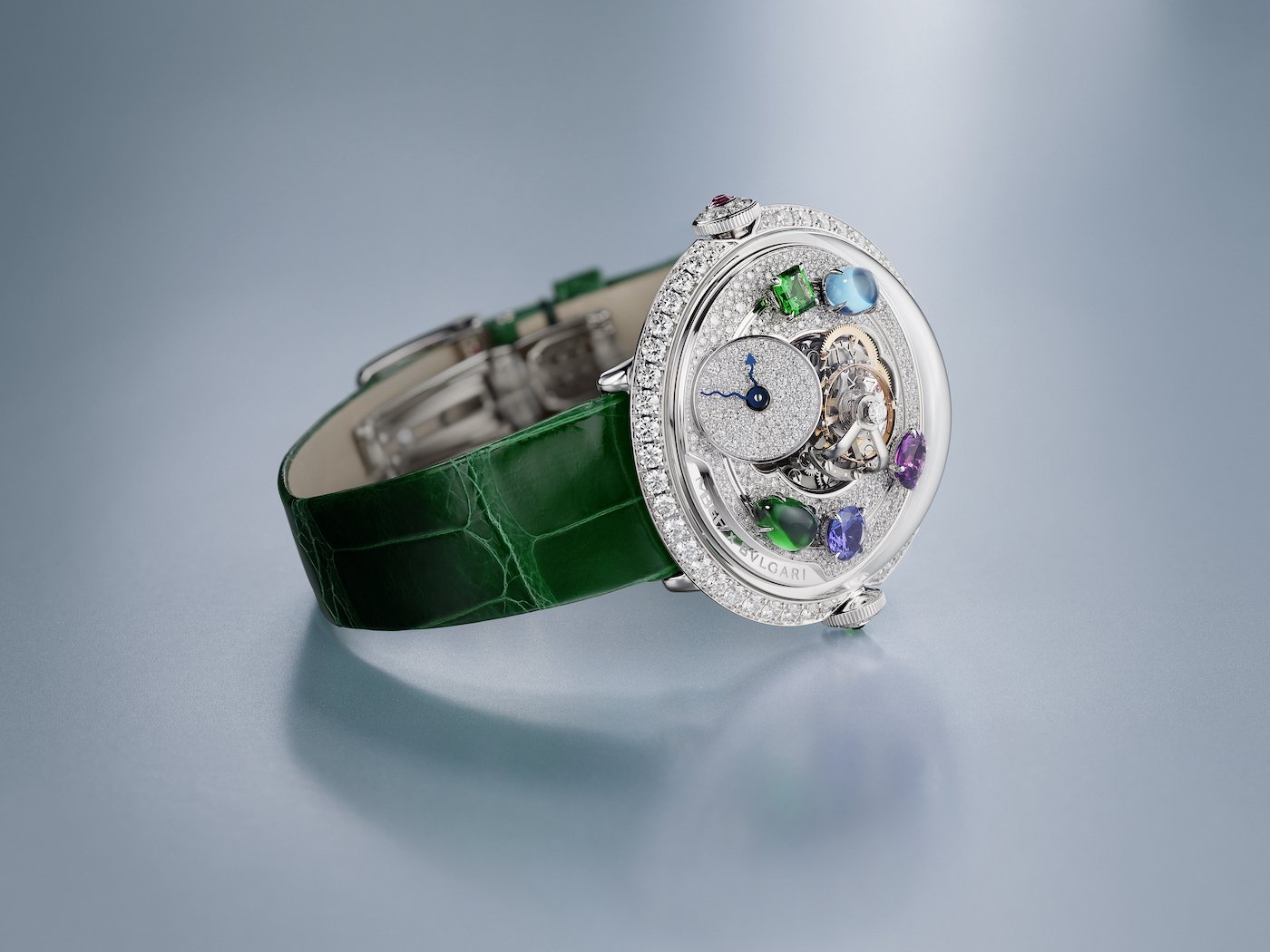 This unusual construction with its feminine-themed design could not have been more appropriate for Bulgari. The volumes of the watch – featuring a case entirely redesigned by Bulgari to give it a futuristic and opulent profile – are matched by those of the coloured stones. These gems serve to counterbalance the cold precision and micromechanical complexity of this model by instilling the Roman jeweller’s warm and exuberant signature touch.