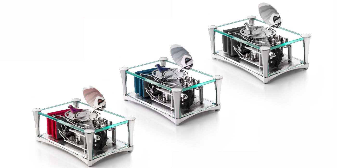Four choices of color pairing the bird with the leather bellows are available so as to suit any aspiration. Monochrome has pride of place in the steel black execution; the bright fuchsia and metallic blue versions give the collection a chromatic boost; finally, the latest Green Canary execution brings us closer still to the natural embodiment of a canary bird. All the birds are made of titanium for the body and wings and gold for the beak. To obtain a color gradient on the body of the bird, a craftsman dips this body part in successive stages in a galvanic bath.