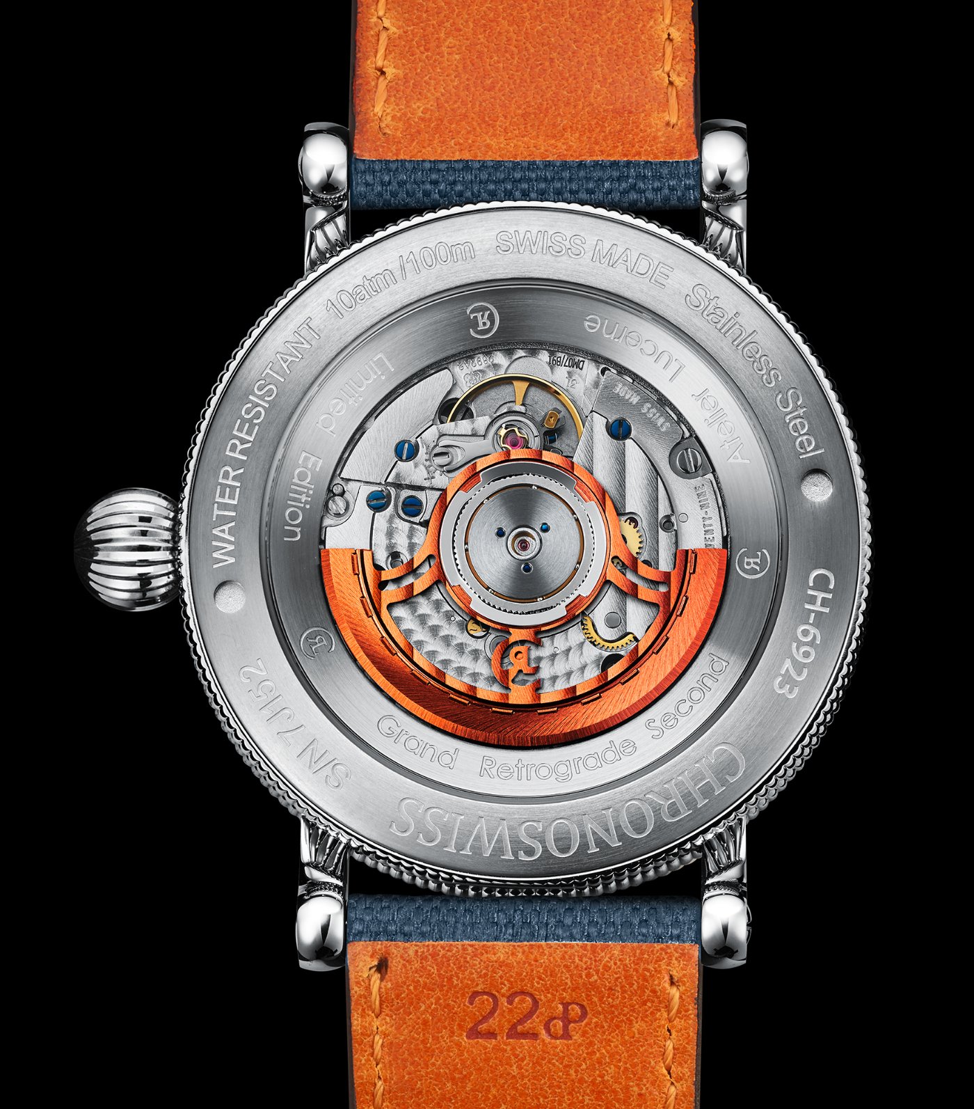 The blue and orange hues on the timepiece are achieved by taking contemporary materials one step further, particularly chemical vapour deposition. The handmade guilloché dial is coated with CVD in a material combination unique to Chronoswiss. The funnelled subdials and the straight-grained bridge are also coated with CVD in the two complementary colours.