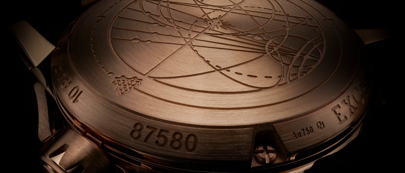 What’s more, ultra-fine lines were laser engraved directly onto a black PVD plate underneath the calibre to reveal the artist’ s cosmic design. A similar process was used on the 18K EON GOLDTM* case-back to embed the artist’s intricate hand-drawn decoration.