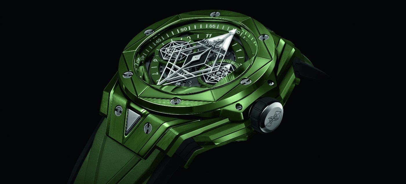 In a 45 mm diameter case made from Magic Gold or Ceramic, the master tattoo artist’s designs alternate and are superimposed on the case and bezel, with the mechanism-/disc-hands taking the form of a geometric tattoo that extends to the rubber strap. This geometry reveals that of the HUB1240 manufacture self-winding Unico chronograph movement, which is visible beneath a skeleton dial and a transparent case back. 100 pieces for the Magic Gold version, 250 for the Black Magic in full black ceramic and 200 for the Green Ceramic.
