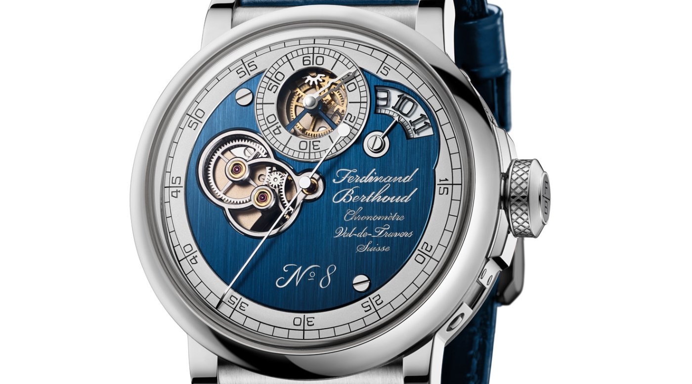 The 18-carat gold dial is hand-engraved and bears the “No. 8” inscription like the original No. 8 Marine Clock, the inspiration for the FB RSM model. The deadbeat seconds mechanism is visible through a special symbolically figure-eight-shaped aperture at 9 o’clock