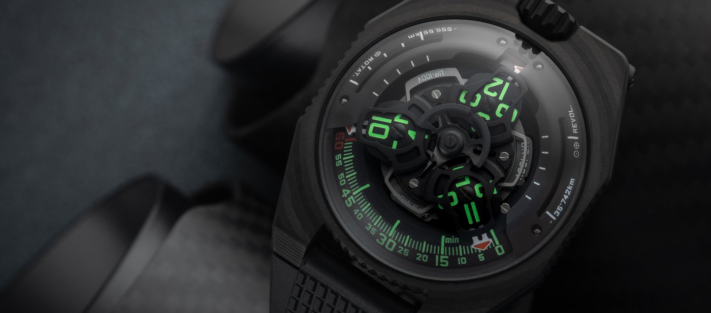 he 100V collection continues its saga. The “Full Titanium Jacket” is now succeeded by the UR-100V C52. A watch with an ultra-tech case made of High Resistance CTP Carbon. An extremely resilient carbon composed of 52 layers compressed in epoxy polymer resin. The use of this unusual material allows the case of the UR-100V C52 to tip the scales at a featherweight 11 grams including titanium back.