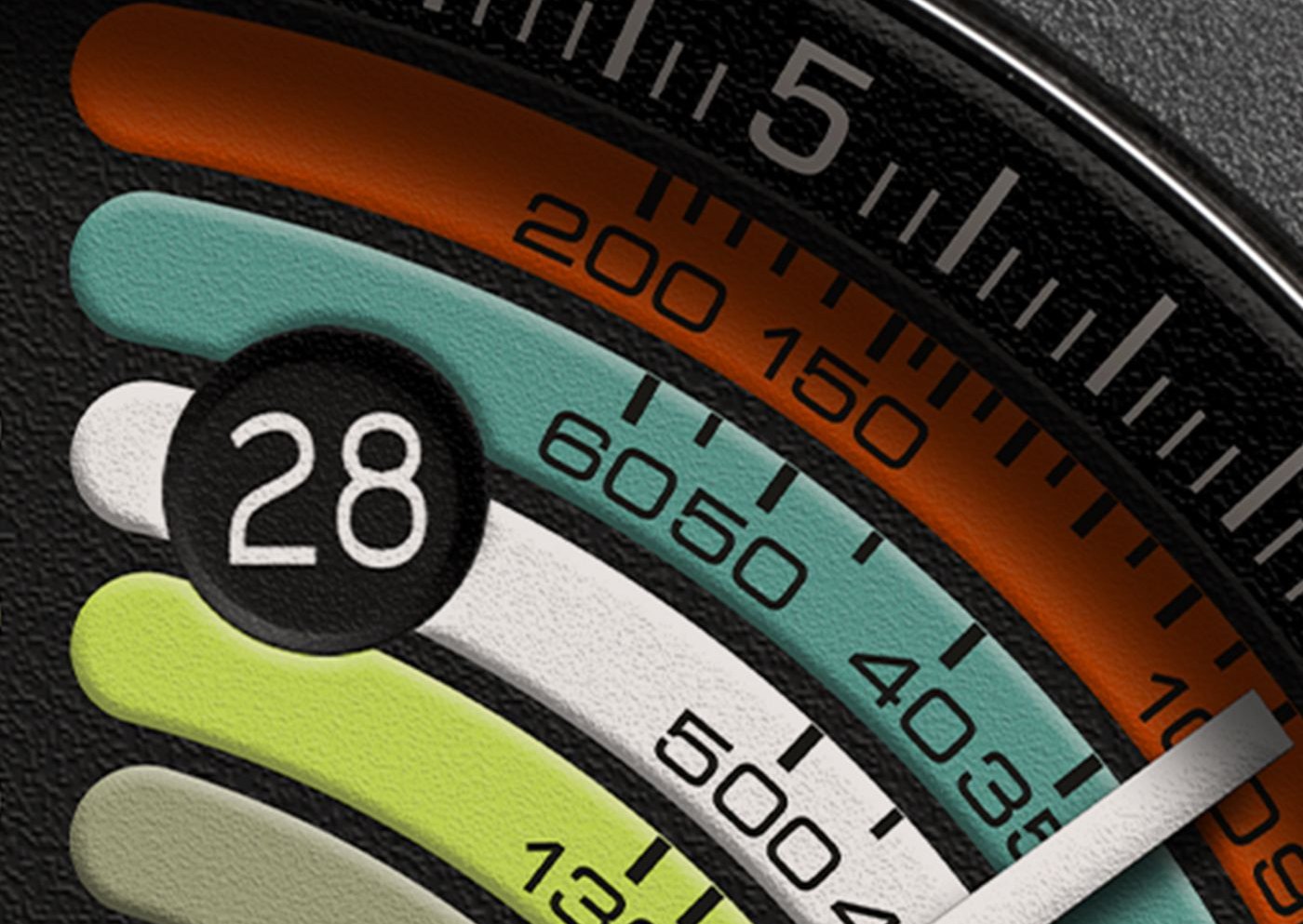 Dial: black. Indicators for 3 tachymeter zones, 1 pulsometer zone and 1 asthmometer zone. Minute track painted white on the flange. Super-LumiNova®-painted hour and minute hands