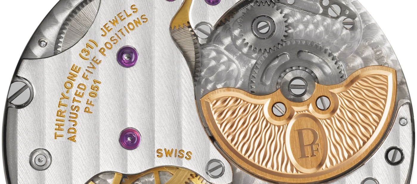 Calibre • PF051 – Automatic Winding Manufacture Movement with split GMT function and rose gold micro-rotor • Power reserve: 48 hours • Frequency: 21,600 Vph (3 Hz) • Jewels: 31 No. of components: 207 • Diameter: 30 mm • Thickness: 4.9 mm • Decoration: Côtes de Genève, Perlage • Oscillating weight: 22ct rose gold micro-rotor, Grain d’Orge guilloché