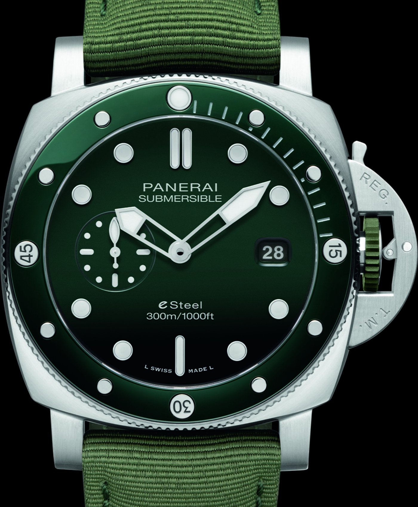 eSteel™ has the same properties as conventional steel, including identical chemical behavior, physical structure and resistance to corrosion, making the metal a natural companion for the iconic Submersible collection of diving watches. An engraving on the crown protection device and inscription on the dial indicate the presence of eSteel™.
