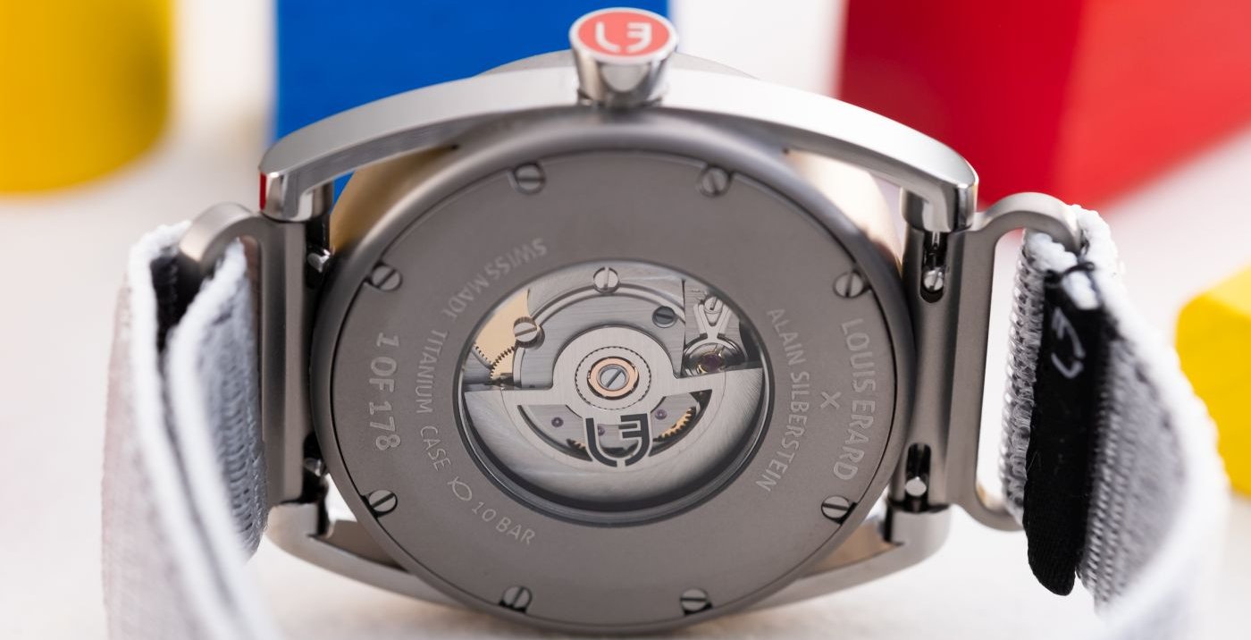 - Case: Microblasted grade 2 titanium & polished grade 5 titanium, Ø40 mm, lug width: 22 mm, lug to lug: 47 mm, thickness: 11.60 mm, 2 pieces, sapphire crystal with anti-reflective treatment on both sides, movement visible through the transparent caseback, water resistant up to a pressure of 10 bars (100 m/330 ft), Alain Silberstein red lacquered signature crown with Louis Erard symbol, caseback engraved with “Louis Erard x Alain Silberstein 1 of 178”