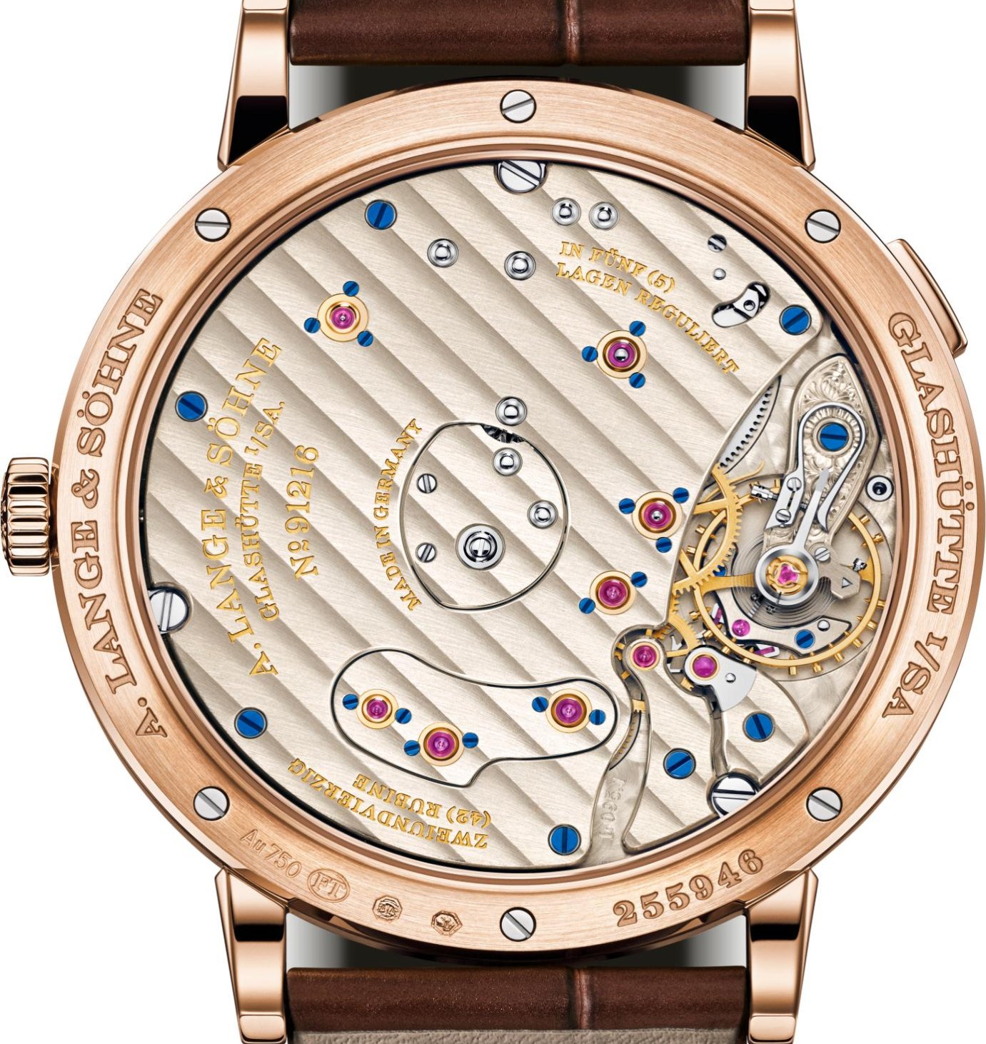 The new model excels with a reduced height of 8.2 millimetres. This allows the watch to snugly embrace the wrist and fit under any cuff. The strict asymmetry of the dial adds extra appeal. The off-centre display of the time includes the Lange outsize date in a gold-framed double aperture, a power-reserve indicator with the characteristic “UP/DOWN” inscription, recessed subsidiary dials with concentric lines and flat appliques.